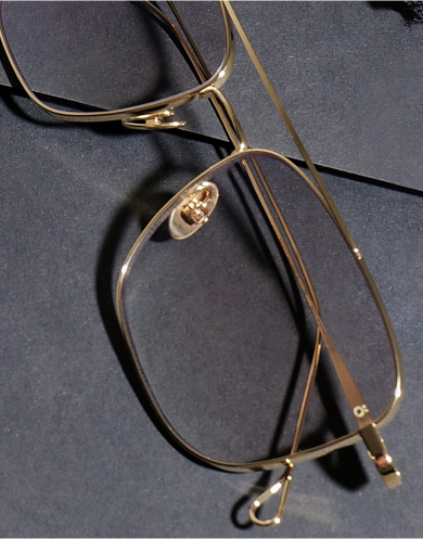For a more nostalgic twist, it's worth checking out Götti's PO-03 and PO-04 frames, showcasing two aviator styles with a totally different appeal. The PO-03 features classic teardrop lenses and a shorter, softer double bridge. In contrast to it, the PO-04's lenses are squared and the bridge is slightly longer, lending a more confident, assertive look. Whichever of these striking models you choose, though, you are sure to add a standout detail to your wardrobe. With both glasses being extremely thin and their finishes harmonizing beautifully with all possible complexions, the double bridge doesn't overwhelm your face but rather adds a delicate accent to your gaze, preciously twinkling at the right angles.