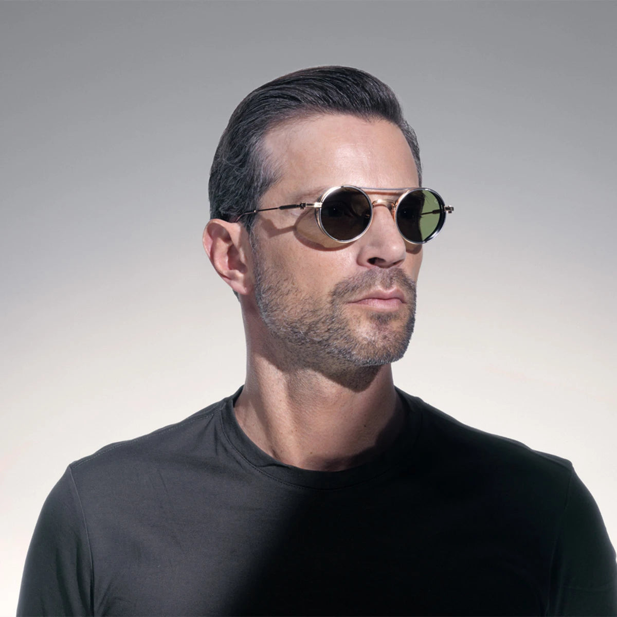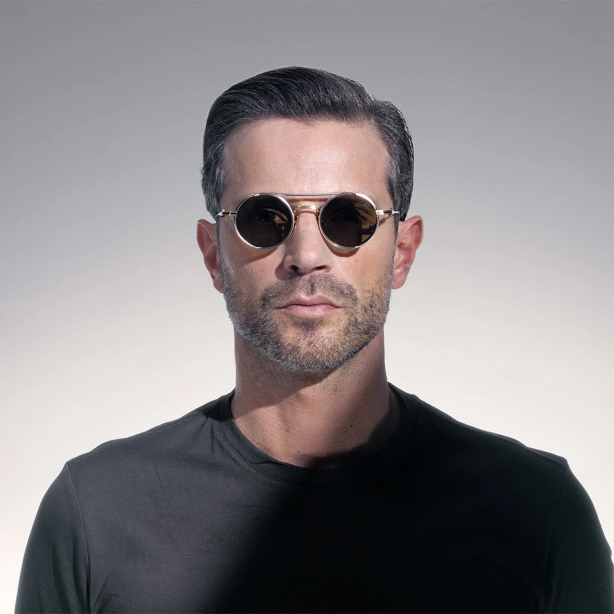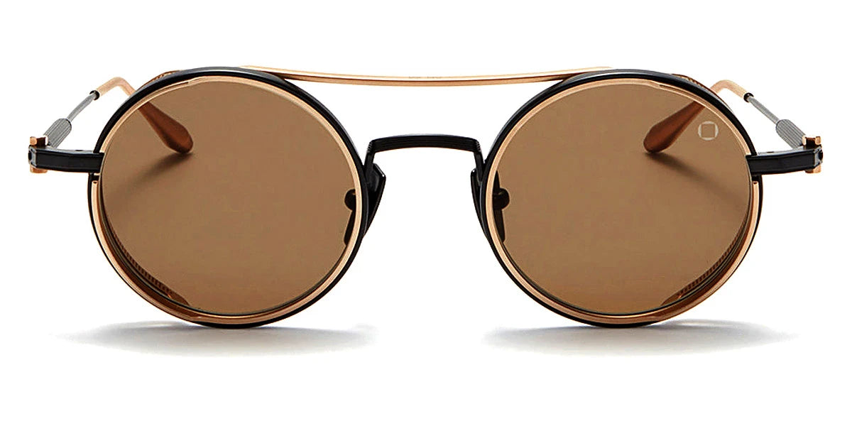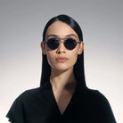 Eris Sunglasses by Akoni™. The round shape design feature a full rim titanium frame. This model is available in four different color combinations and sizes. Expert artisanship and sophisticated materials come together beautifully in this sunglass model, balancing intrigue with accessibility to create frames as wearable as they are conversation-starting works of functional art. Complex layering and clean sculptural lines celebrate the face, while technical details customize optics and weight distribution for sublime comfort.