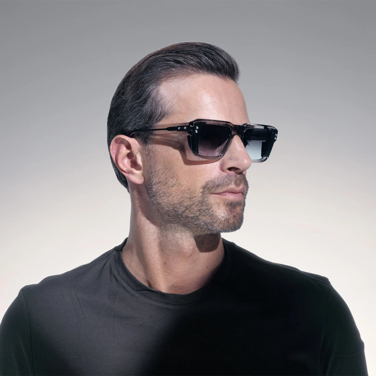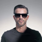 Black Crystal/Black Crystal Side Shields (105D) Sunglasses with Dark Gray to Dark Olive AR lenses (Hercules 105D 54) by Akoni™. Size: 54-20-148, Shape: Square, Material: Acetate.