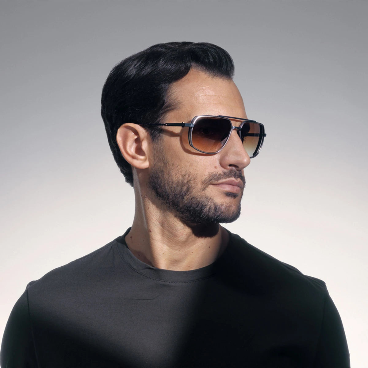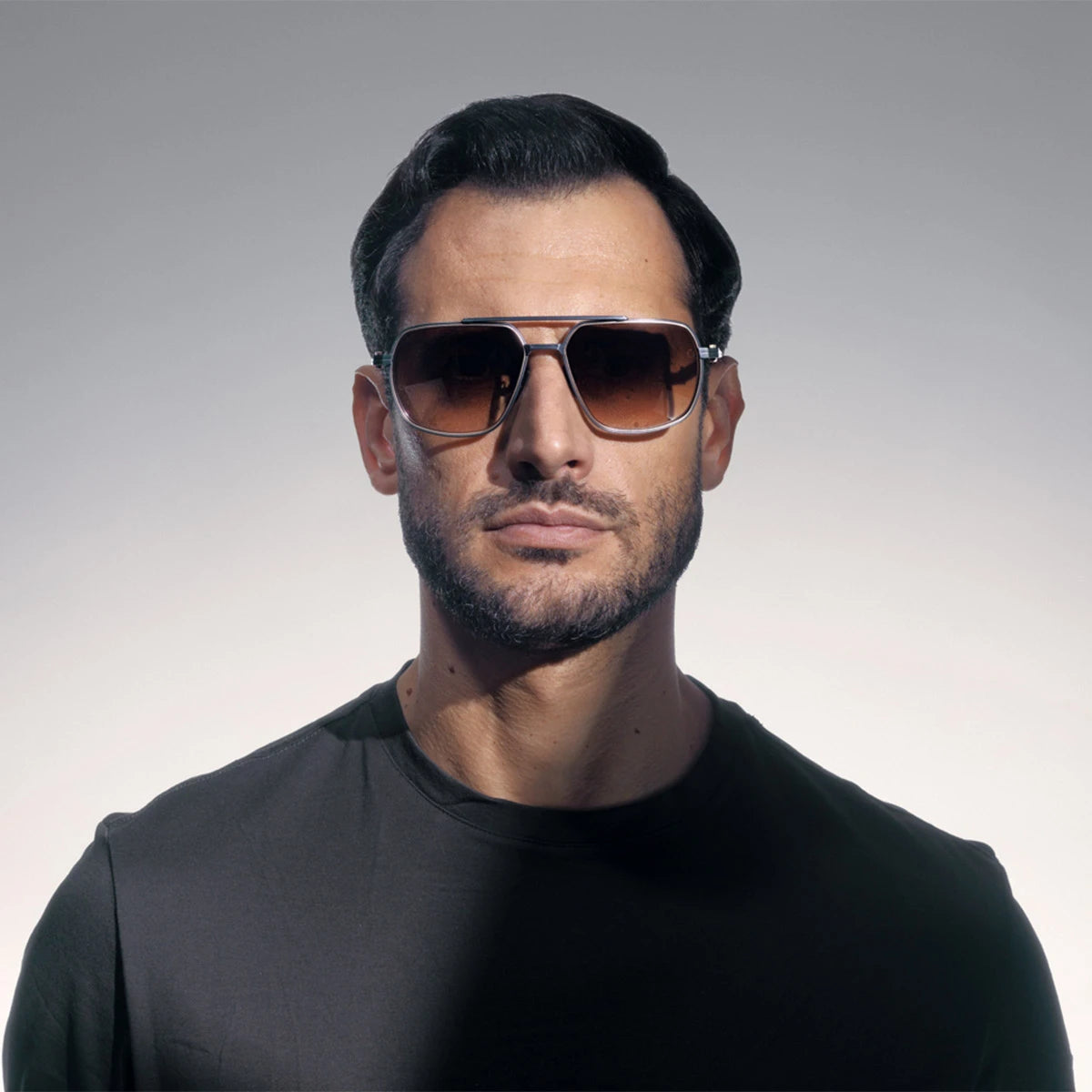 Pathfinder Sunglasses by Akoni™. The aviator shape design feature a full rim titanium frame. This model is available in three different color combinations and sizes. Striking the perfect balance between eye protection, exquisite craftsmanship, and enduring sophistication, this sleek sunglass frame effortlessly keeps pace with modern life. Hand layered materials create dimension and texture, while lens tones nod to the classics. Sculptural slim lines celebrate you while customized features and cutting edge technologies deliver exceptional vision clarity in any light.
