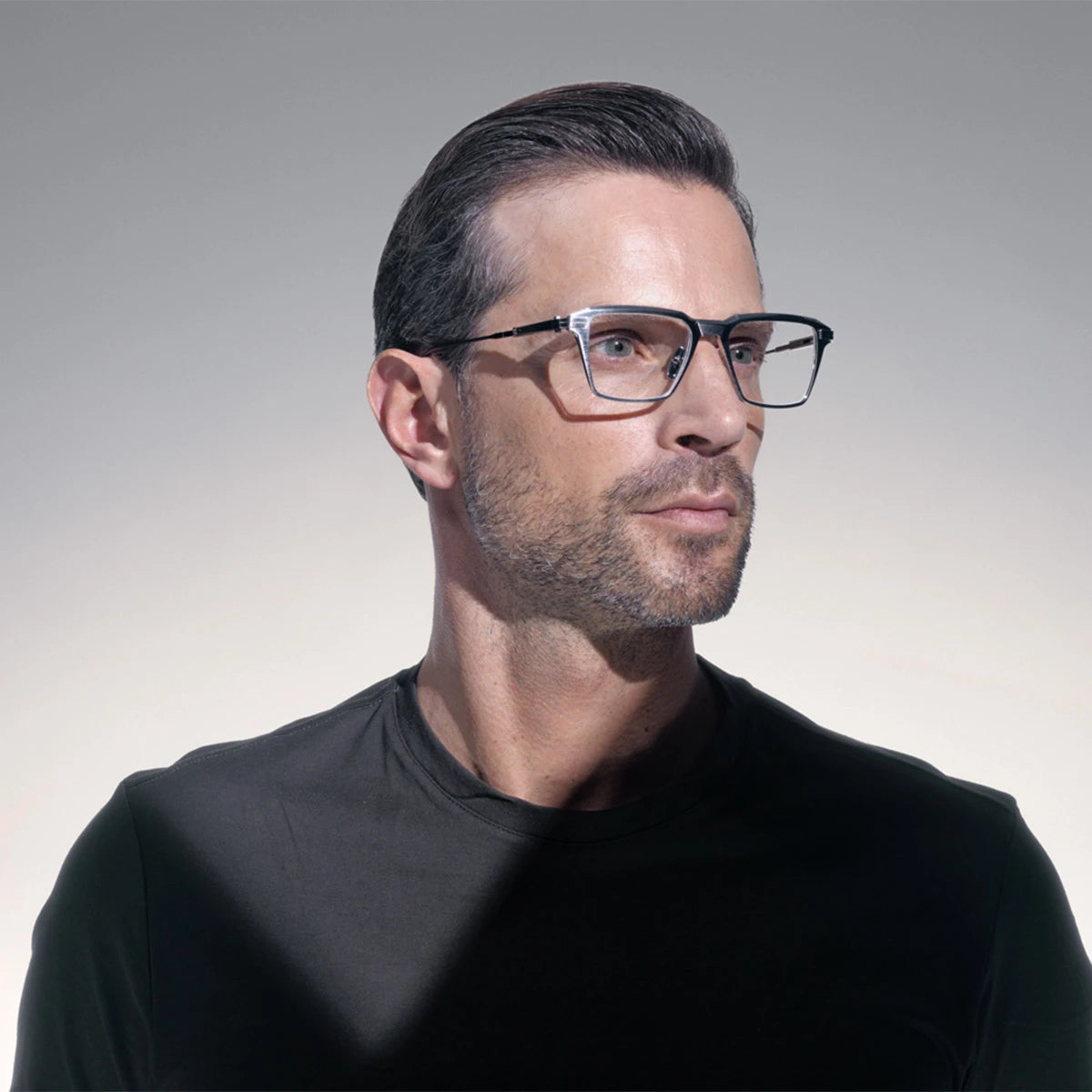 Swift Eyeglasses by Akoni™. The rectangle shape design feature a full rim titanium frame. This model is available in four different color combinations and sizes. This Akoni eyewear model embodies the concept of everyday elegance. It's the perfect choice for individuals who seek an eyewear option that effortlessly transitions from day to night, from work to leisure. With a design that's both versatile and timeless, this model strikes the ideal balance between style and practicality, ensuring you always look your best, no matter the occasion.