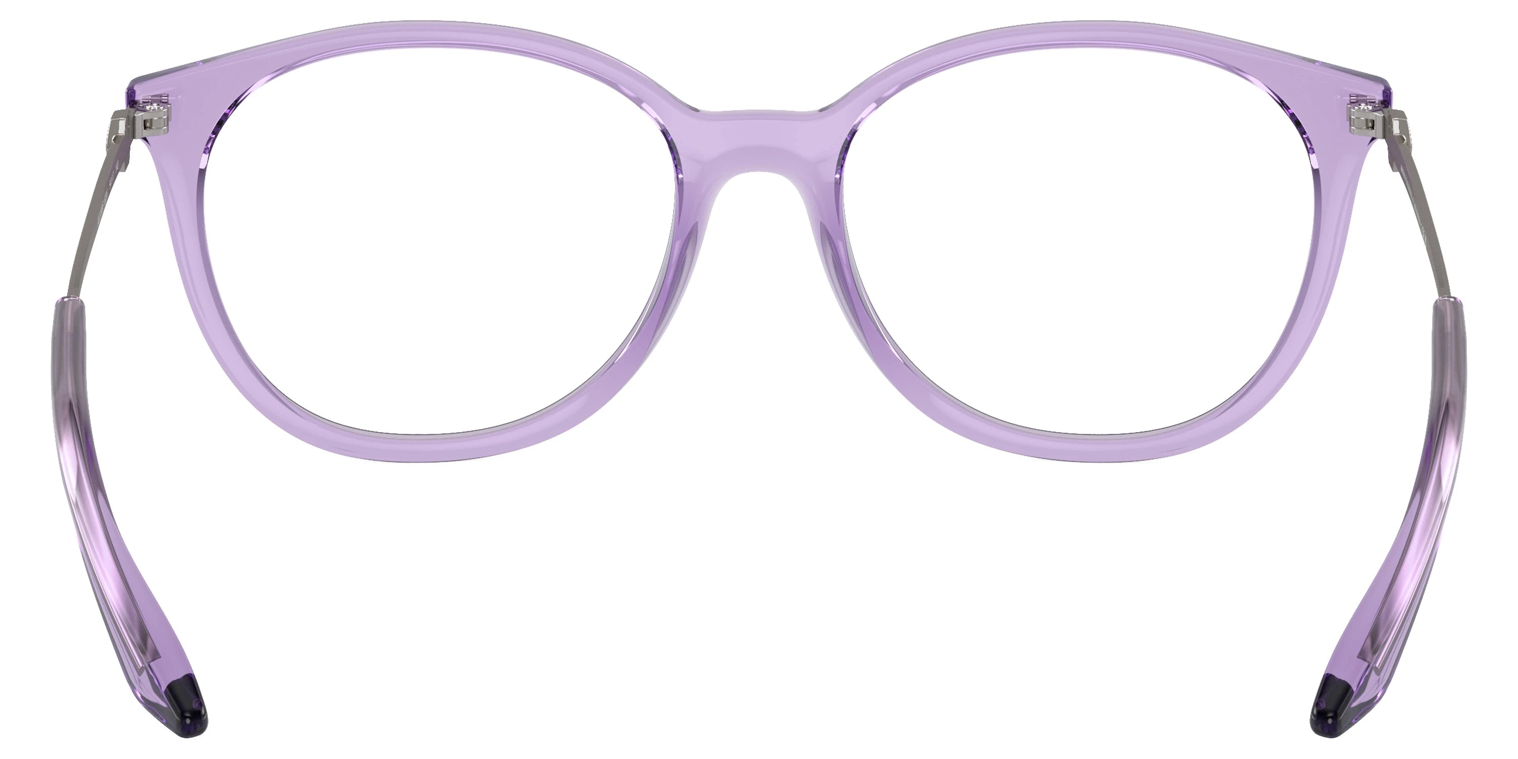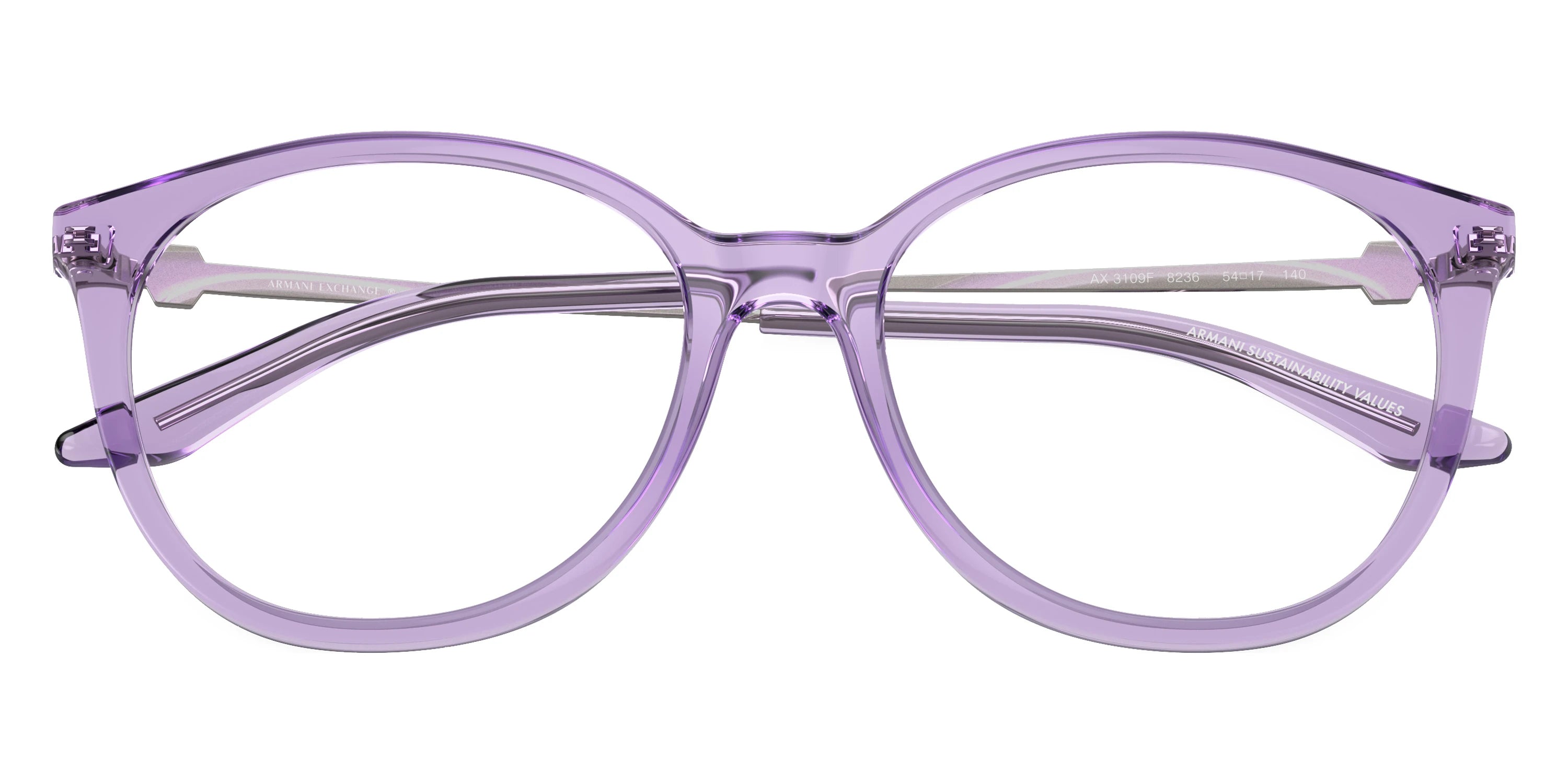 Shiny Transparent Violet/Shiny Gunmetal (8236) Eyeglasses (AX3109F 8236 54) by ARMANI EXCHANGE™. Size: 54-17-140, Shape: Cat-Eye, Material: Acetate and Metal.