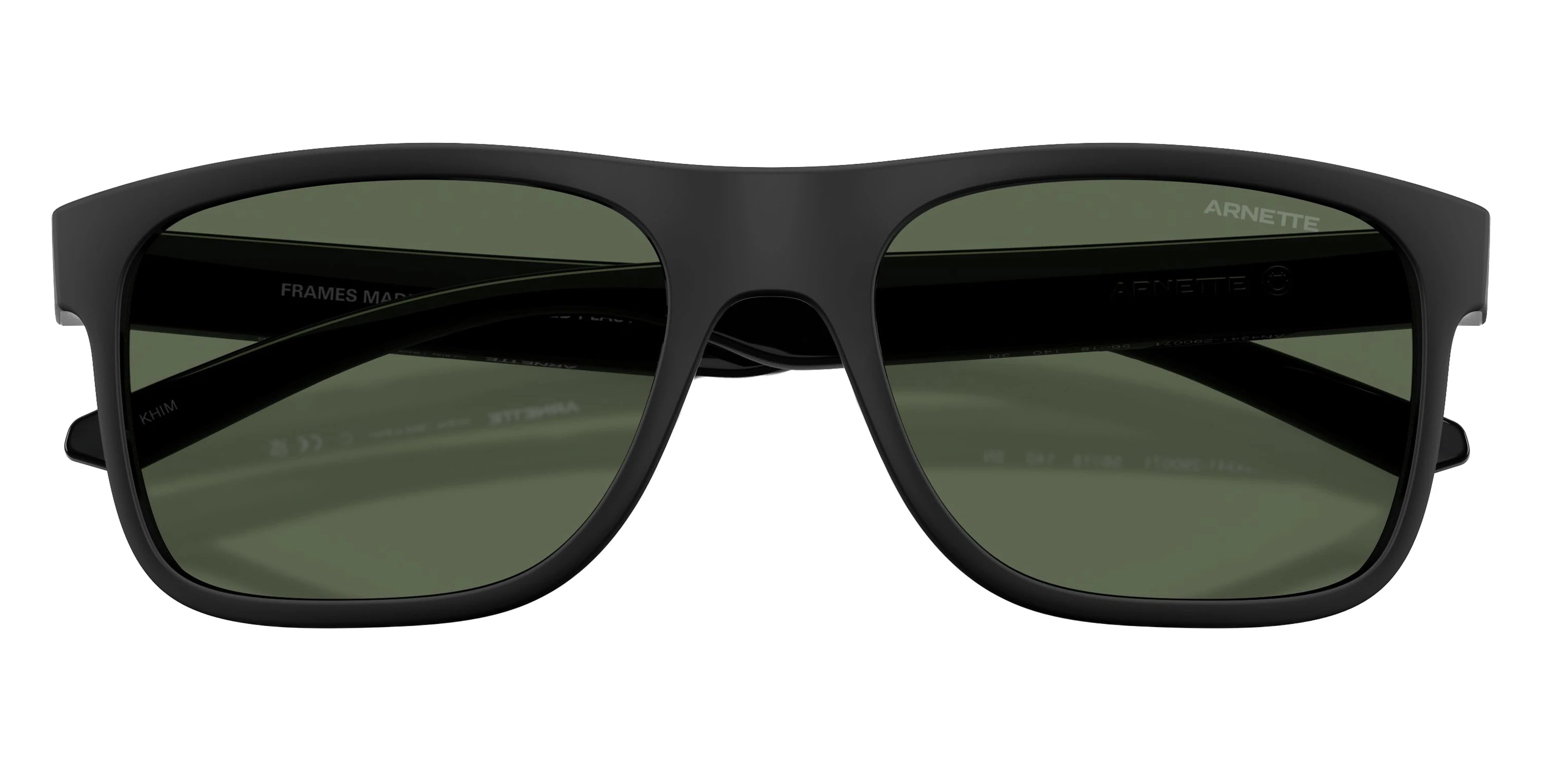 Black Matte/Shiny/Black Camouflage (290071) Sunglasses with Dark Green lenses (AN4341 Khim 290071 56) by ARNETTE™. Size: 56-18-140, Shape: Square, Material: Injected.