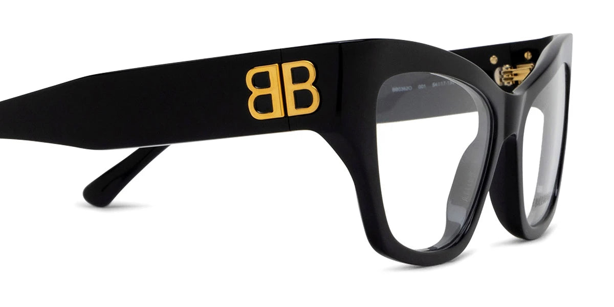 Black (001) Eyeglasses (BB0362O 001 54) by Balenciaga™. Size: 54-17-135, Shape: Butterfly, Material: Recycled Acetate.