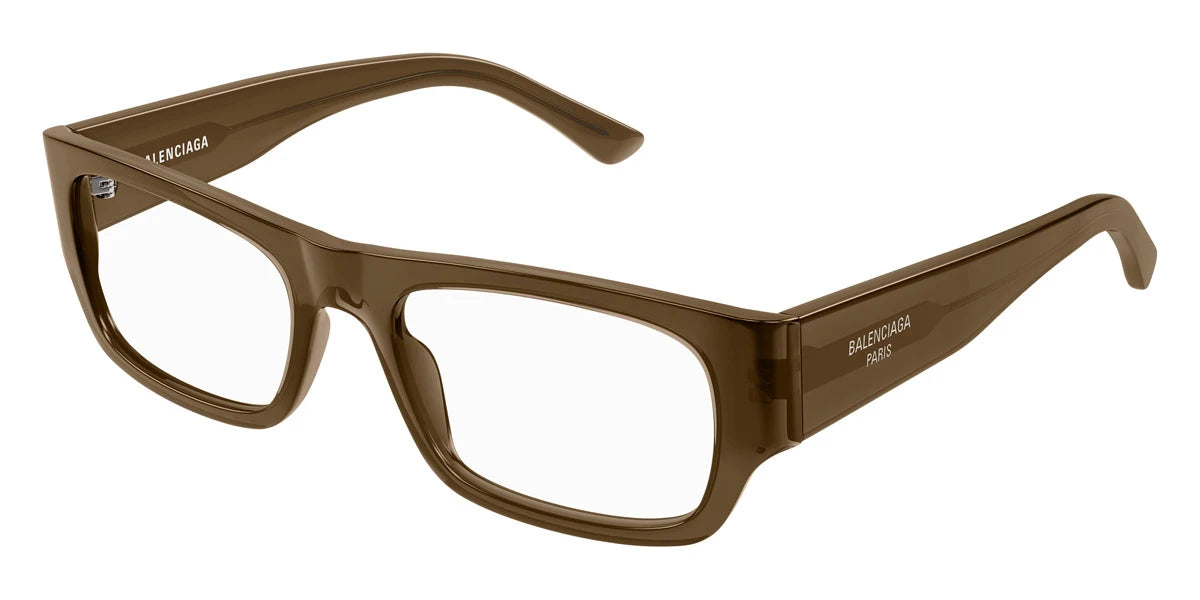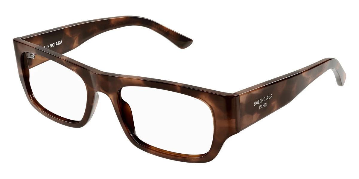 Havana (002) Eyeglasses (BB0370O 002 54) by Balenciaga™. Size: 54-19-145, Shape: Rectangle, Material: Recycled Acetate.