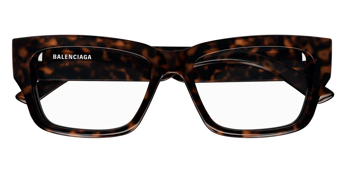 Havana (002) Eyeglasses (BB0376O 002 54) by Balenciaga™. Size: 54-16-145, Shape: Square, Material: Recycled Acetate.