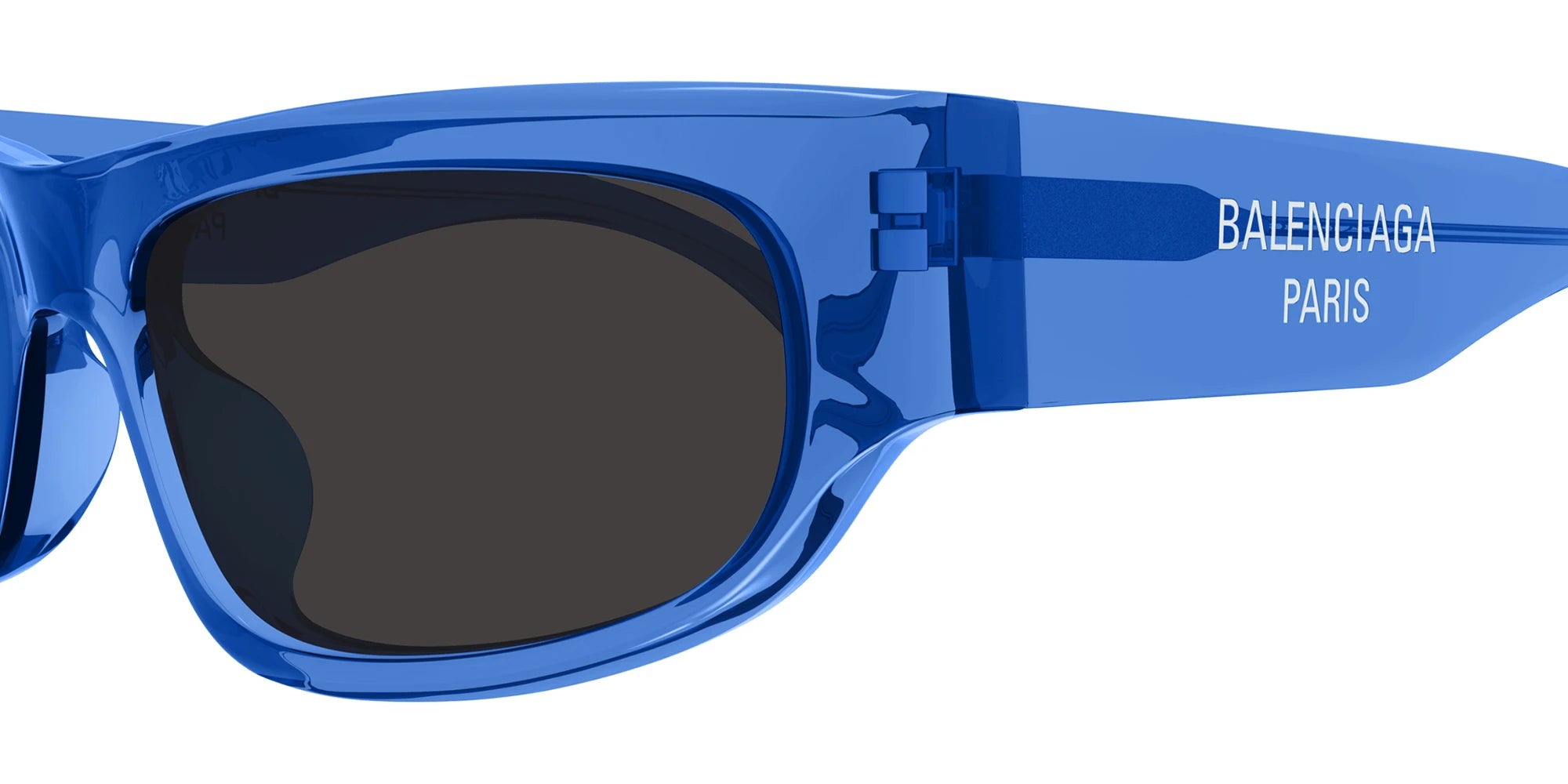 Blue (003) Sunglasses with Gray lenses (BB0388S 003 56) by Balenciaga™. Size: 56-19-140, Shape: Narrow, Material: Recycled Acetate.