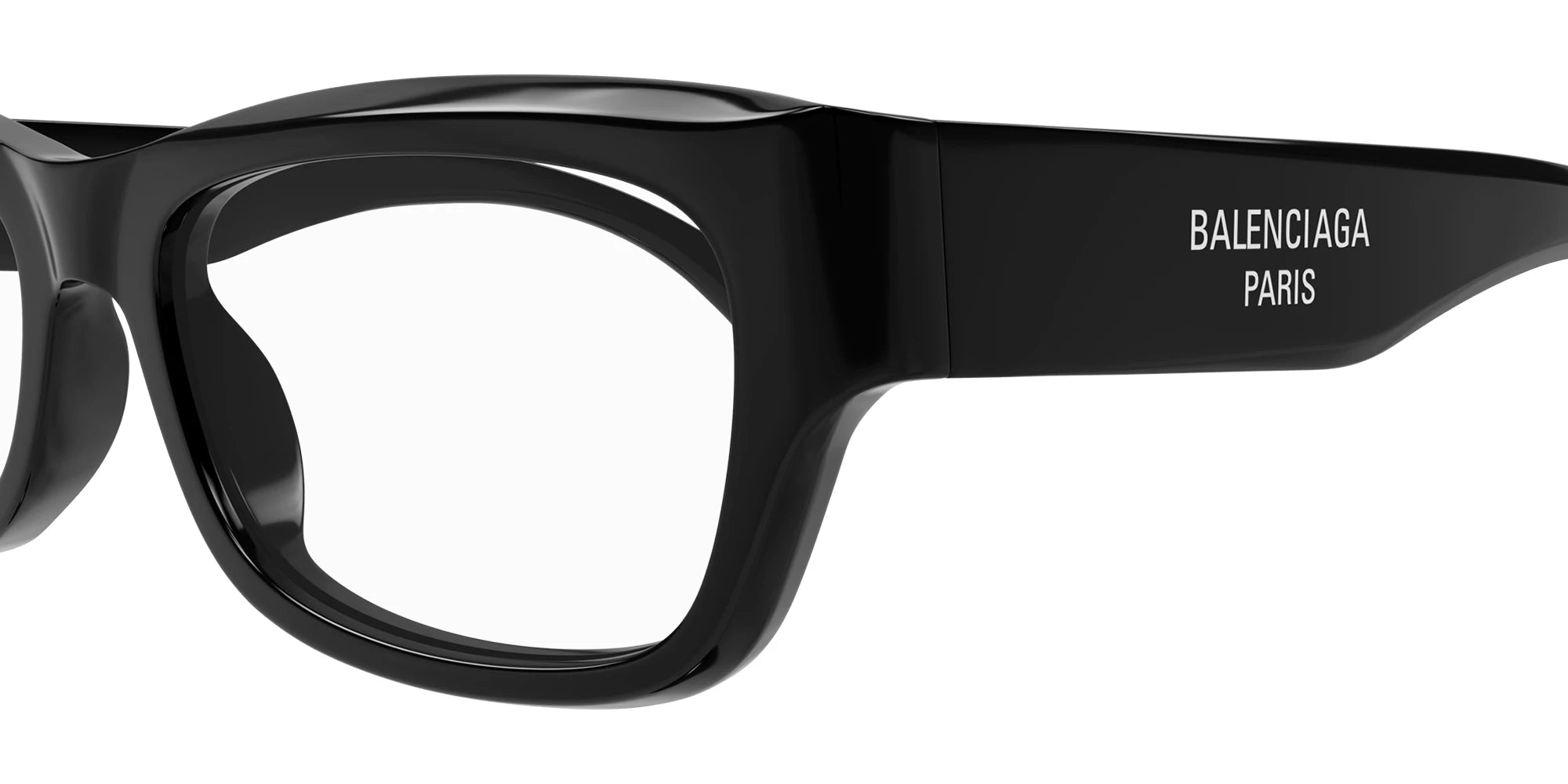 Black (001) Eyeglasses (BB0392O 001 55) by Balenciaga™. Size: 55-19-140, Shape: Rectangle, Material: Recycled Acetate.