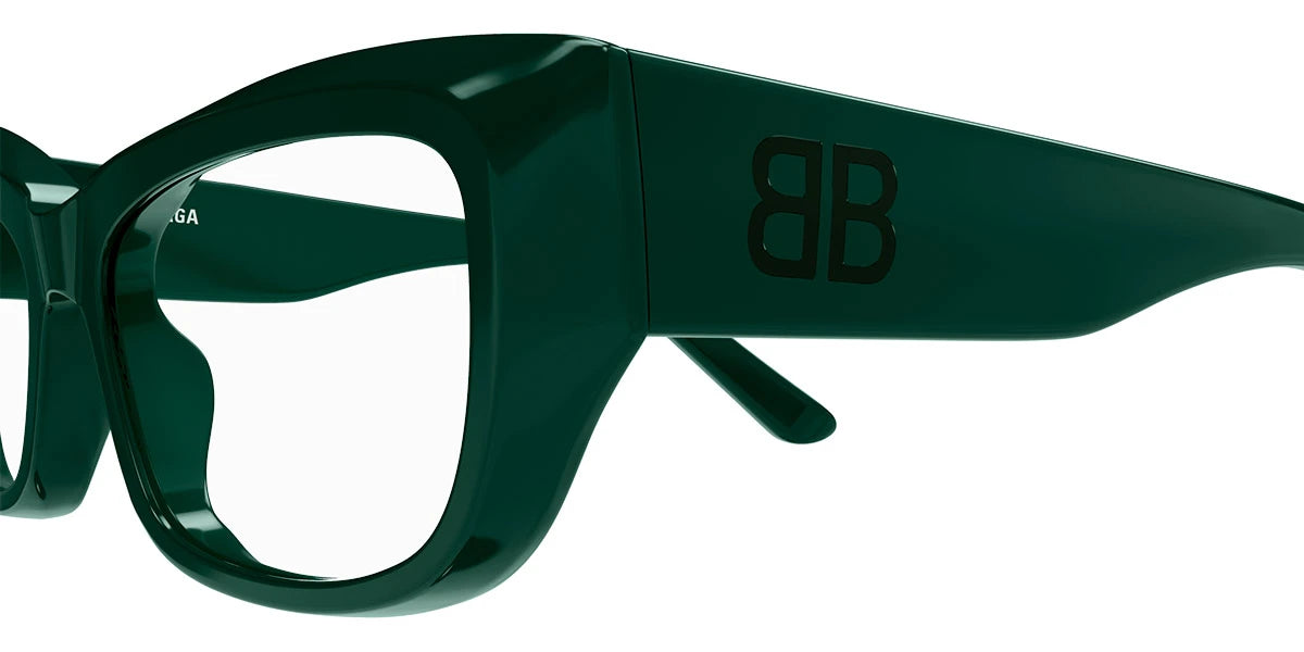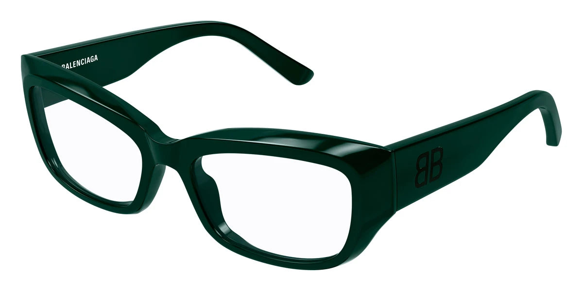 Green (004) Eyeglasses (BB0399O 004 55) by Balenciaga™. Size: 55-18-145, Shape: Rectangle, Material: Recycled Acetate.