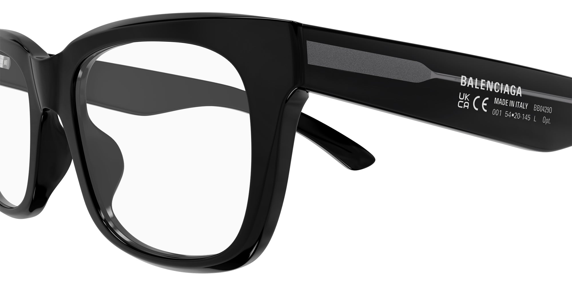 Black (001) Eyeglasses (BB0429O 001 54) by Balenciaga. Size: 54-20-145, Shape: Square, Material: Recycled Acetate.