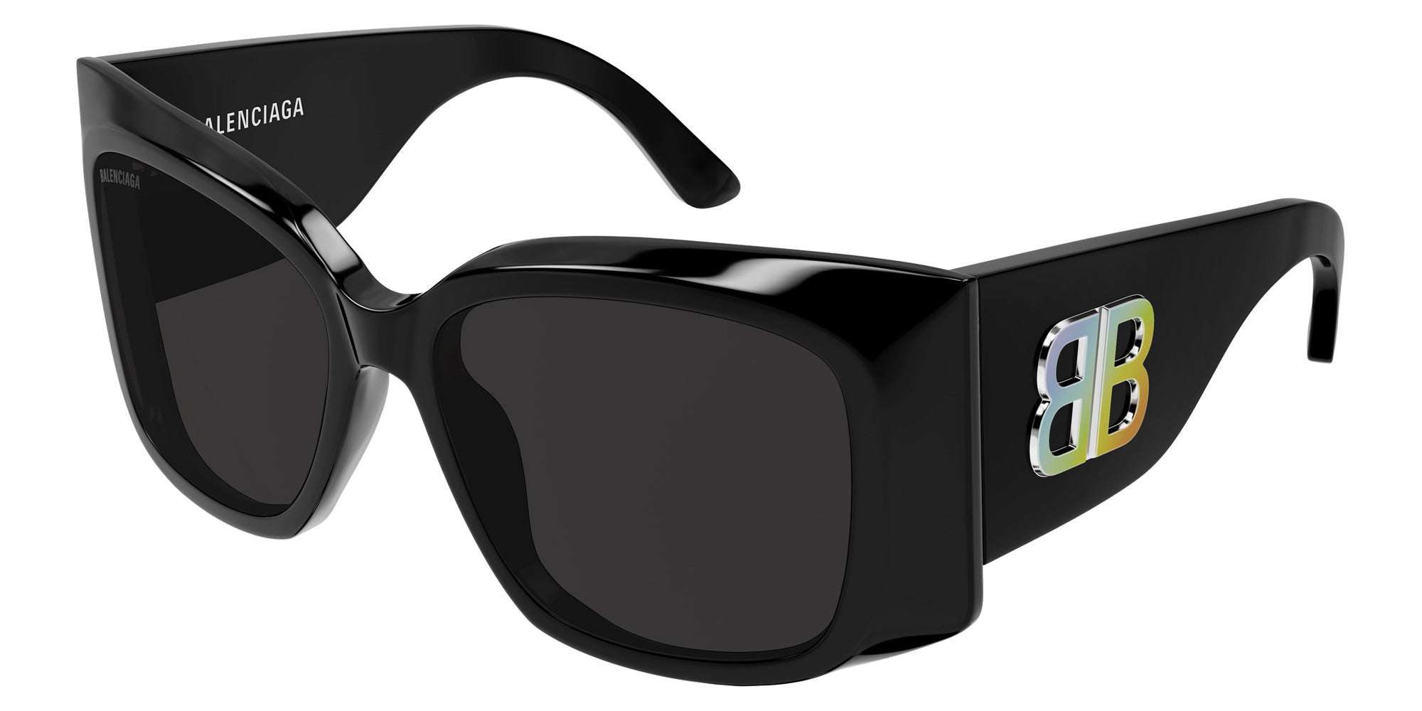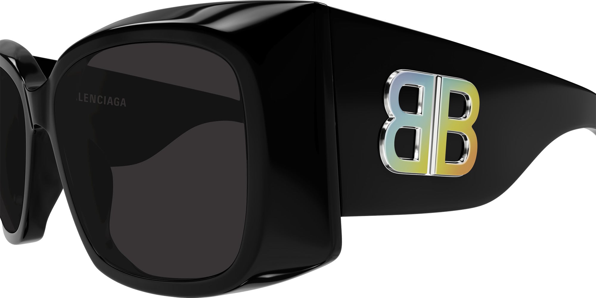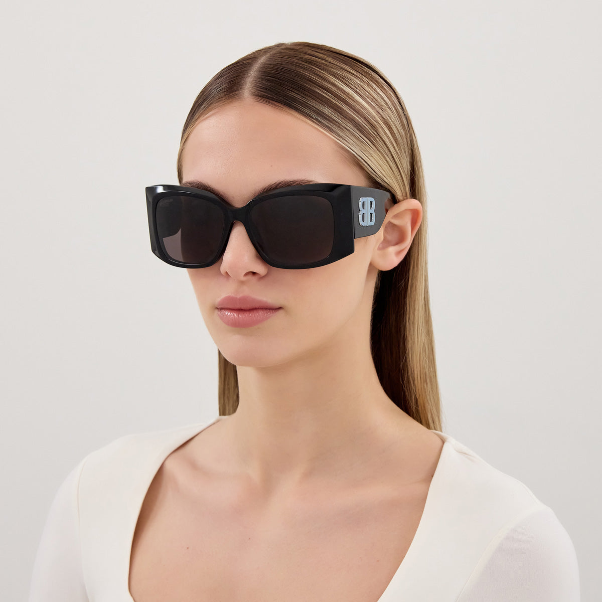 Black (002) Sunglasses (BB0443S 002 58) by Balenciaga. Size: 58-17-145, Shape: Oversized, Material: Recycled Acetate.