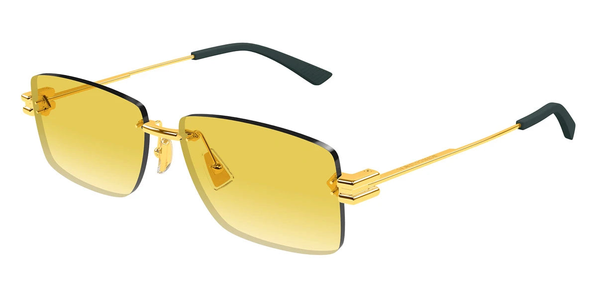 Gold (006) Sunglasses with Yellow Gradient lenses (BV1126S 006 58) by Bottega Veneta™. Size: 58-15-145, Shape: Rectangle, Material: Metal.