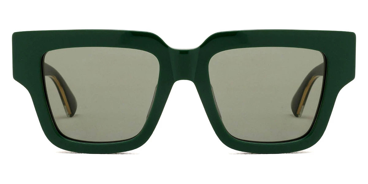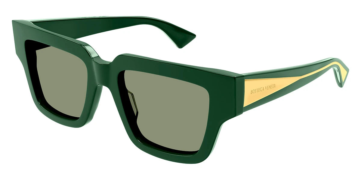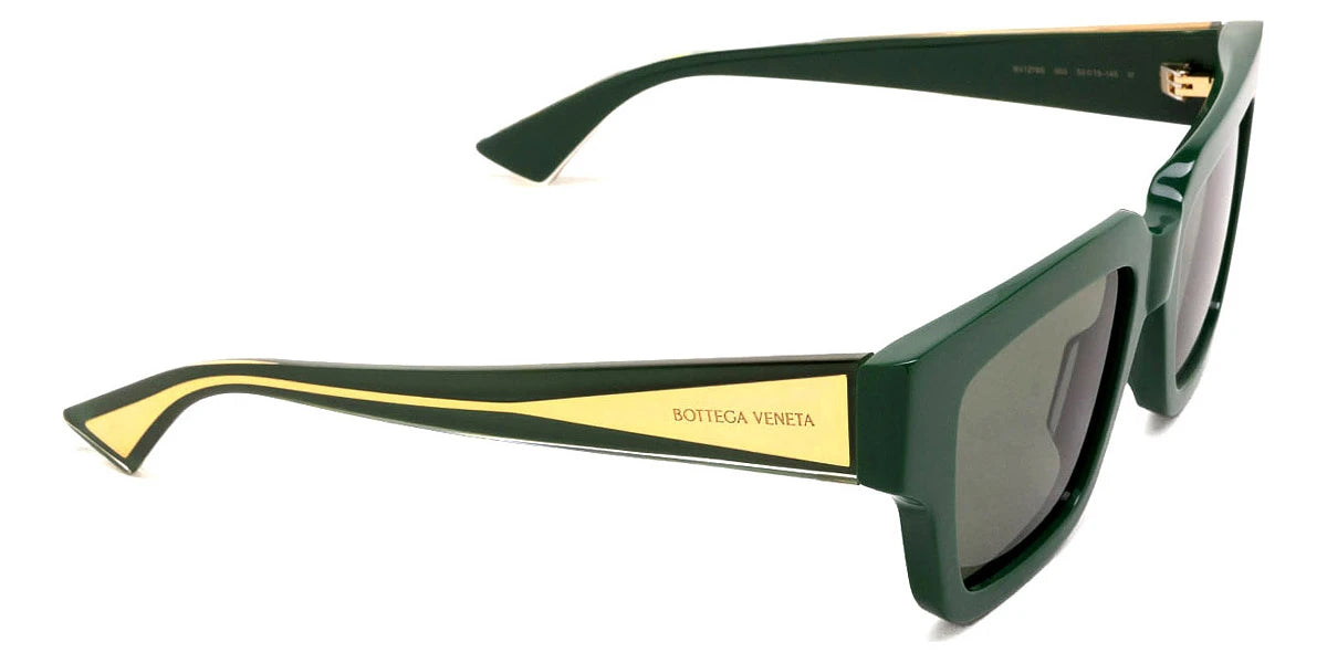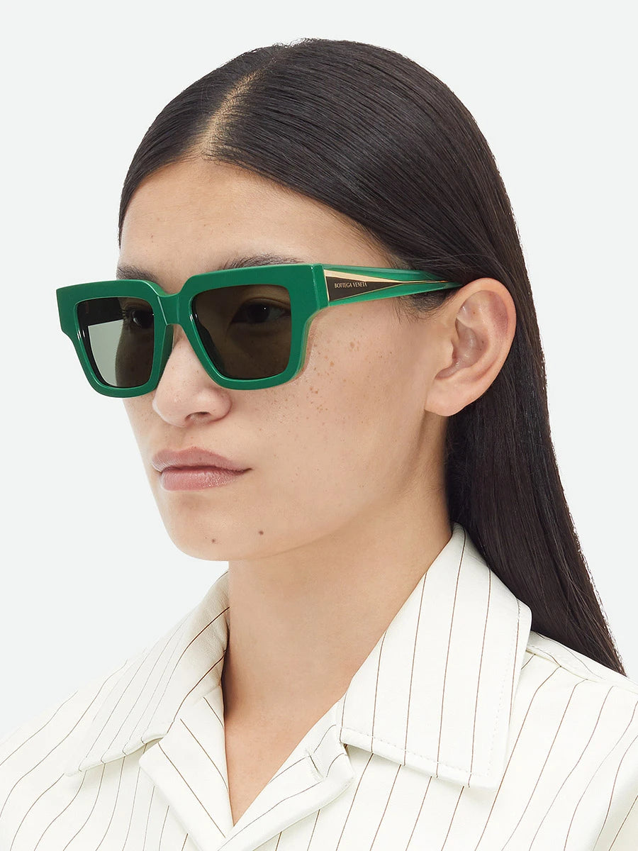 Green/Crystal (003) Sunglasses with Green lenses (Tri-Fold BV1276S 003 52) by Bottega Veneta™. Size: 52-19-145, Shape: Square, Material: Recycled Acetate and Resin.
