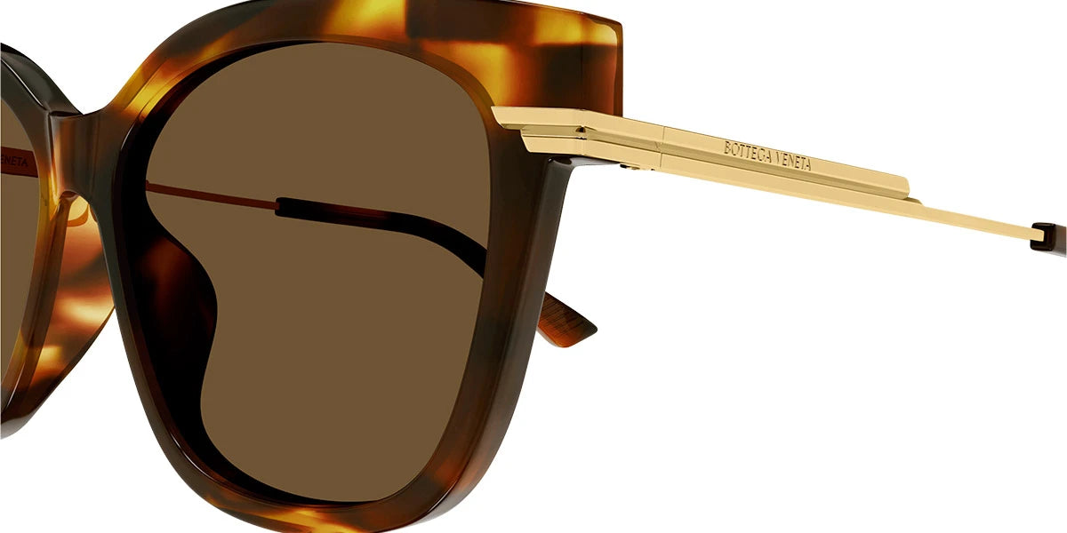 Every pair of Bottega Veneta sunglasses features an original logo of the brand on the temple.