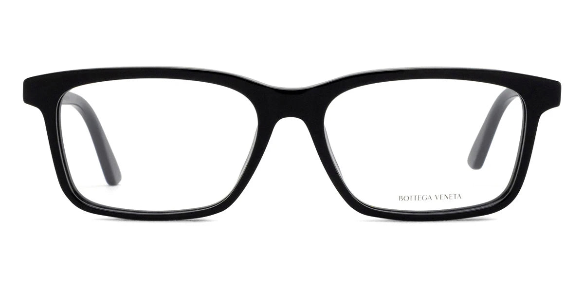Black (006) Eyeglasses (BV1314O 006 57) by Bottega Veneta™. Size: 57-16-145, Shape: Rectangle, Material: Recycled Acetate.