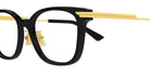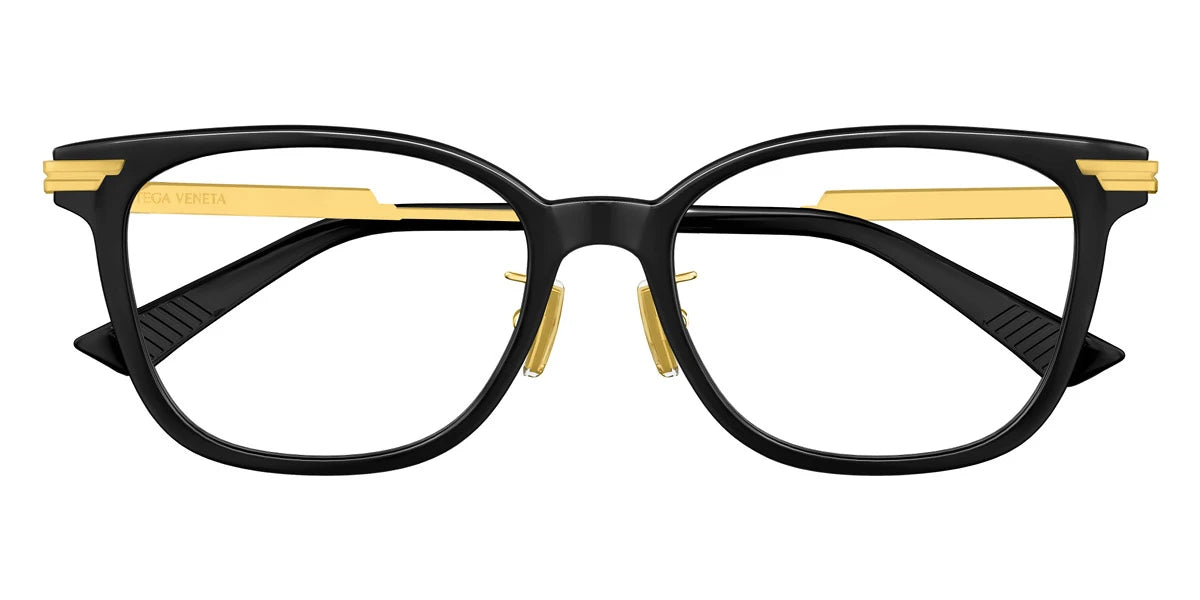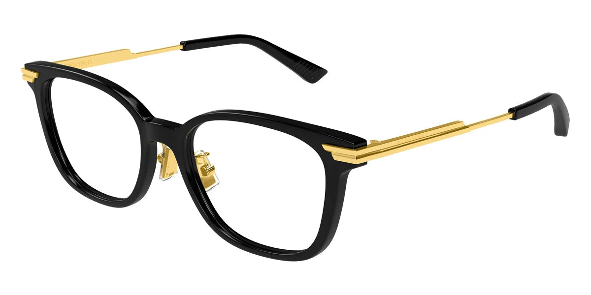 Black/Gold (001) Eyeglasses (BV1338OJ 001 53) by Bottega Veneta™. Size: 53-17-140, Shape: Aviator, Material: Recycled Acetate and Metal.