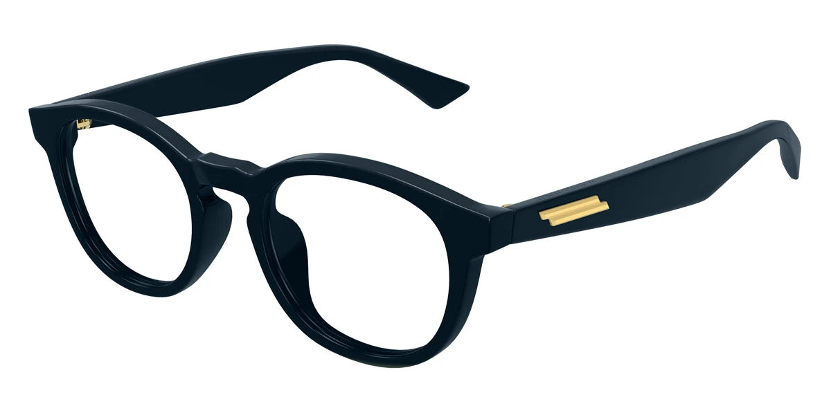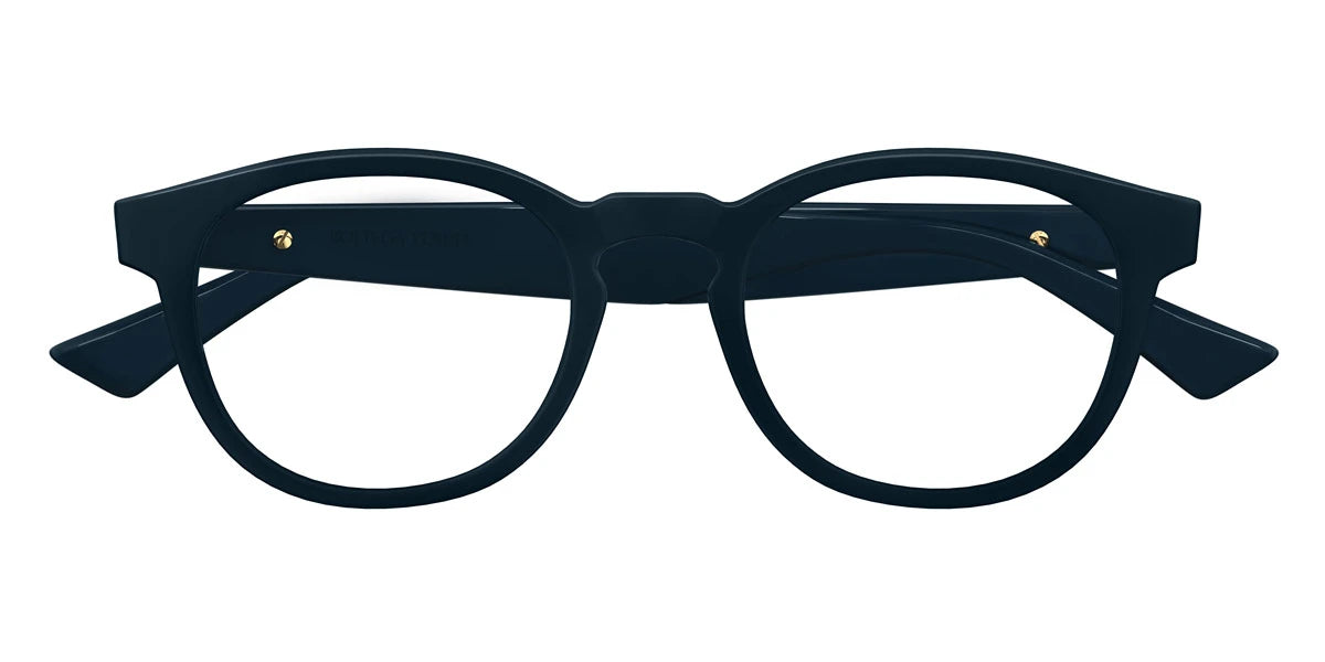 Blue (004) Eyeglasses (BV1339OK 004 50) by Bottega Veneta™. Size: 50-21-145, Shape: Irregular, Material: Recycled Acetate.