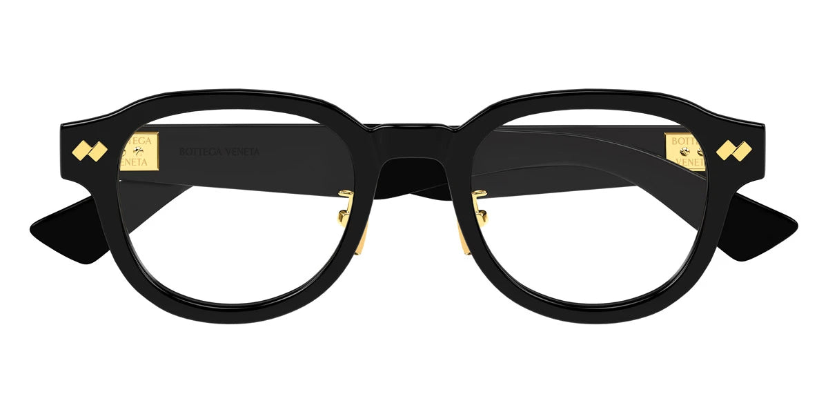 Black (005) Eyeglasses (BV1355OJ 005 51) by Bottega Veneta™. Size: 51-20-145, Shape: Wayfarer, Material: Recycled Acetate.