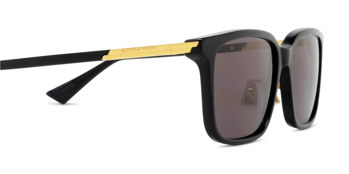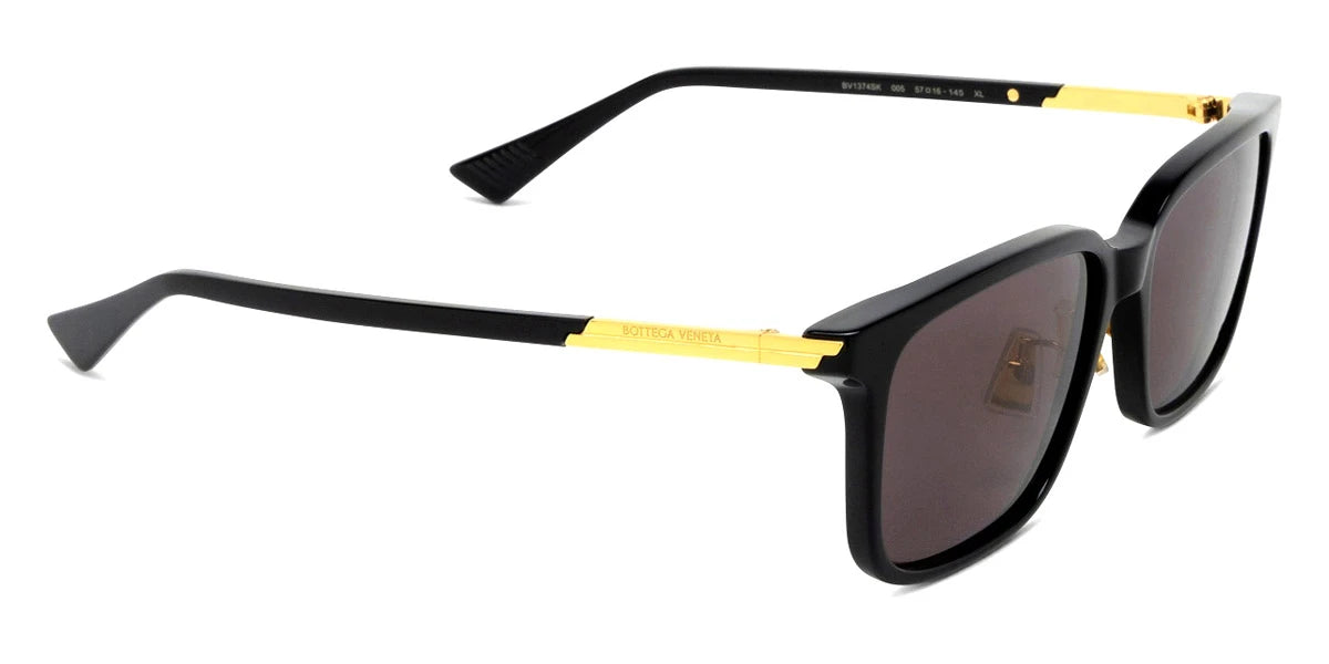 Black/Gold (005) Sunglasses with Gray lenses (BV1374SK 005 57) by Bottega Veneta™. Size: 57-16-145, Shape: Square, Material: Recycled Acetate and Metal.