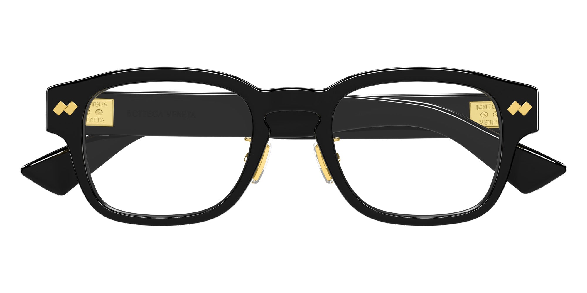 Black (005) Eyeglasses (BV1404OA 005 53) by Bottega Veneta. Size: 53-22-145, Shape: Square, Material: Recycled Acetate.