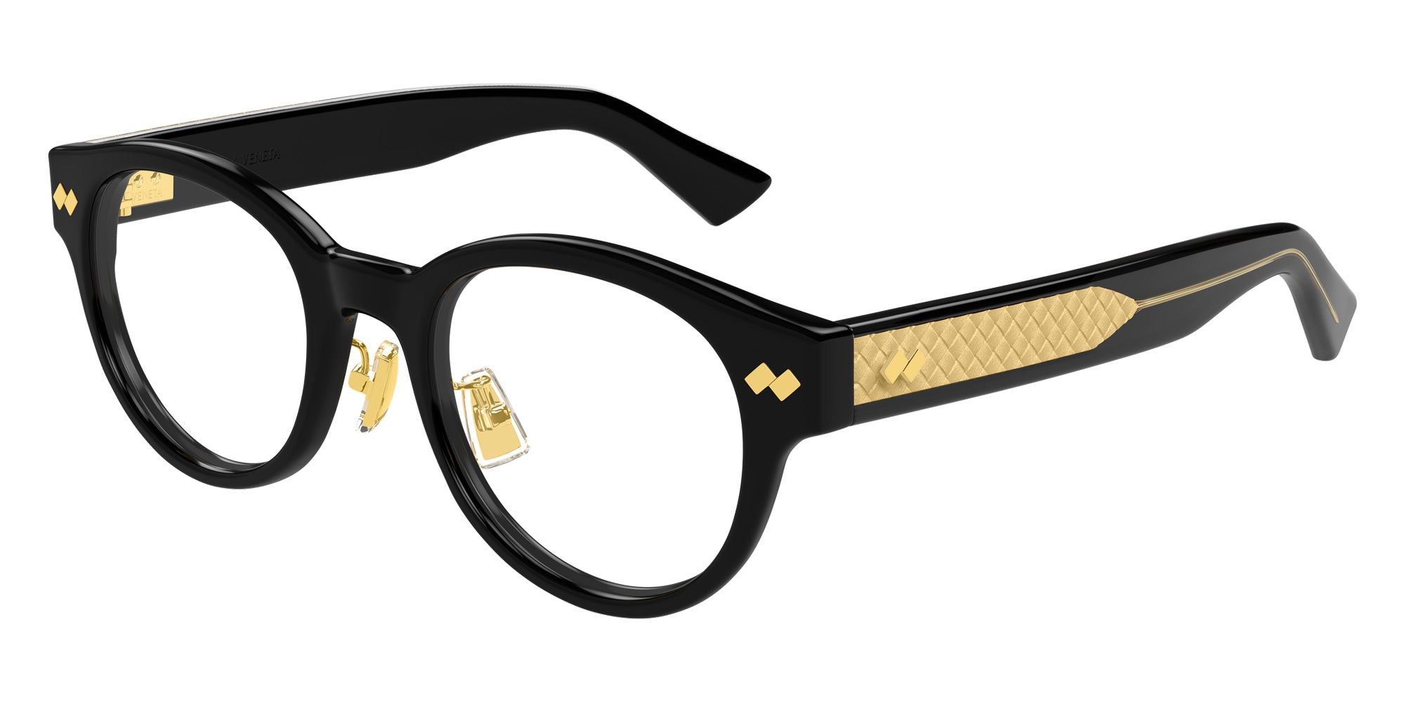 Black (001) Eyeglasses (BV1405OA 001 50) by Bottega Veneta. Size: 50-21-145, Shape: Round, Material: Recycled Acetate.