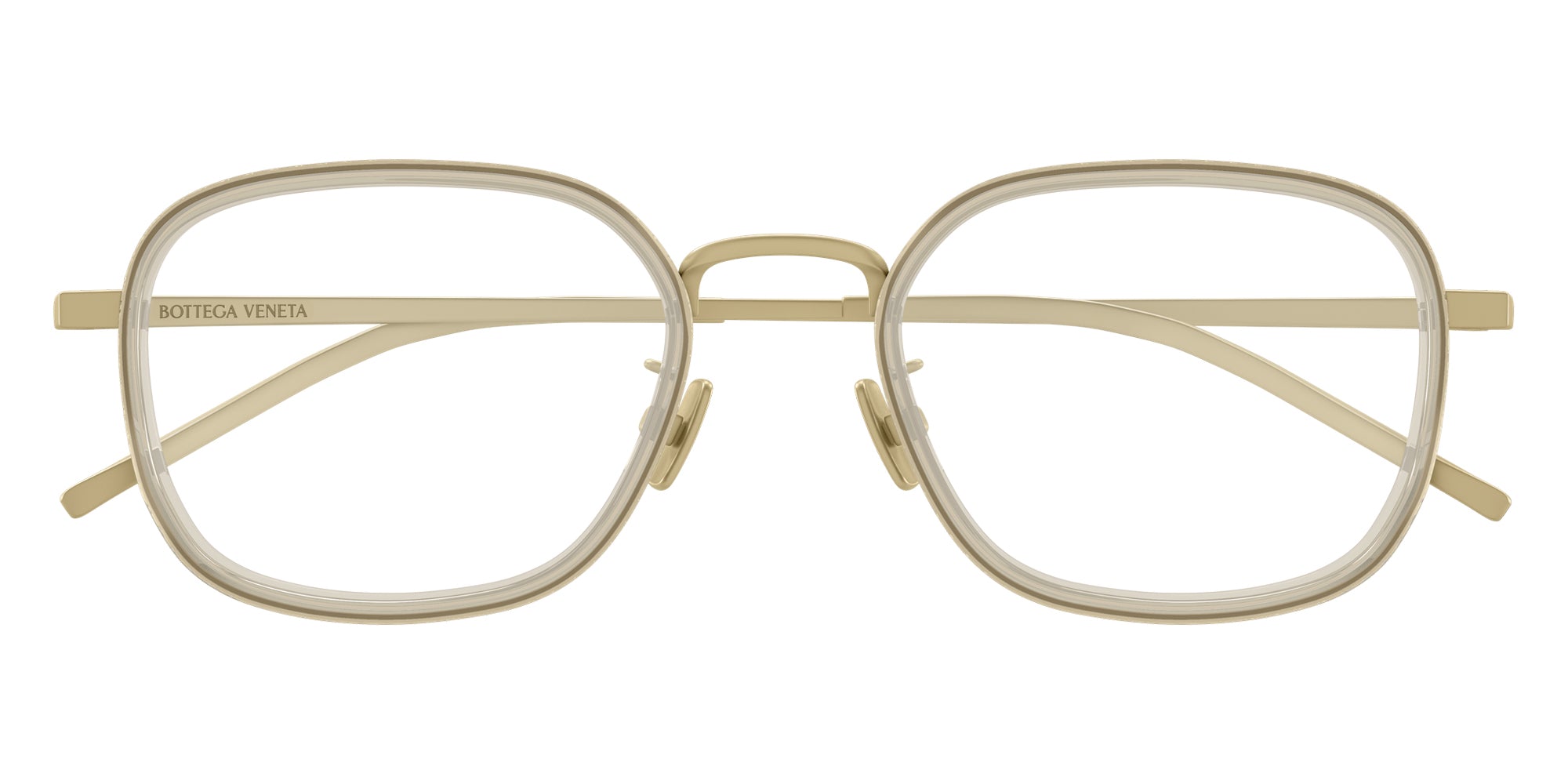 Bronze (003) Eyeglasses (BV1427OA 003 52) by Bottega Veneta. Size: 52-20-145, Shape: Square, Material: Titanium and Recycled Acetate.