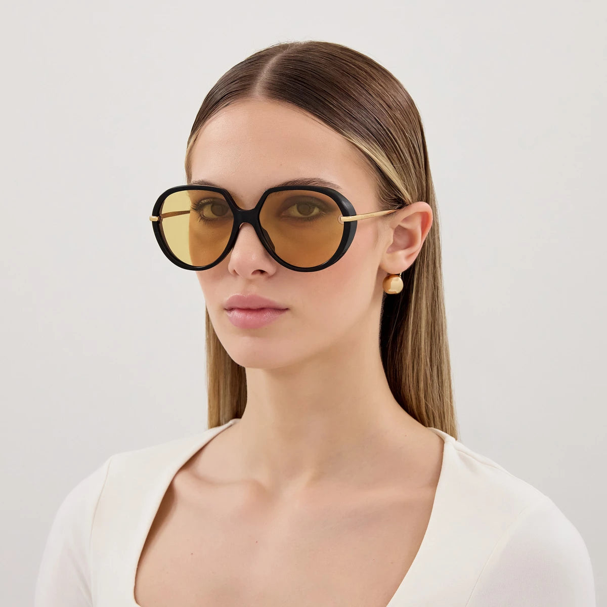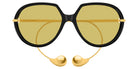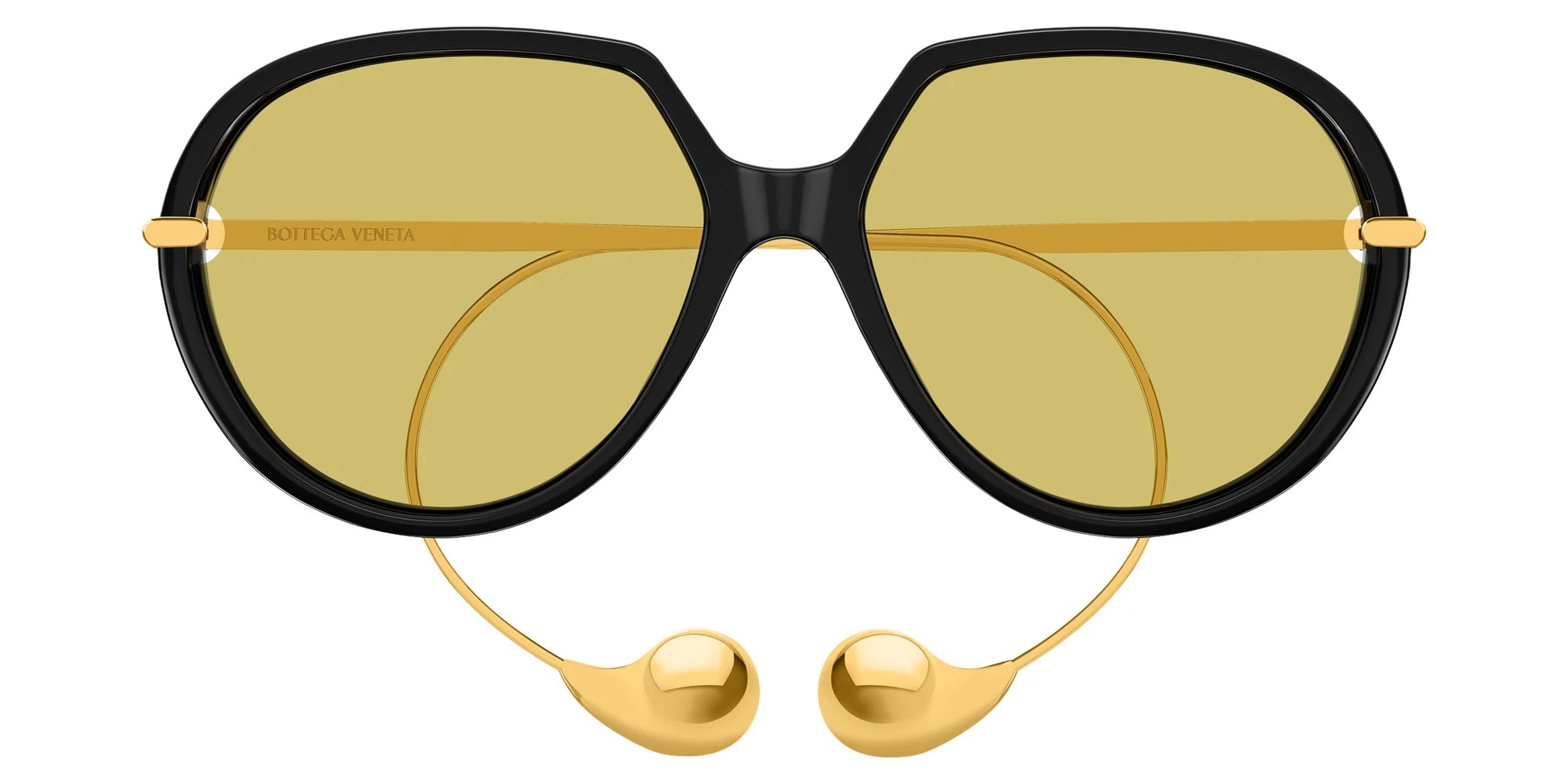 Black/Gold (001) Sunglasses with Yellow lenses (BV1436S 001 60) by Bottega Veneta™. Size: 60-16-185, Shape: Oversized, Material: Recycled Acetate and Metal.