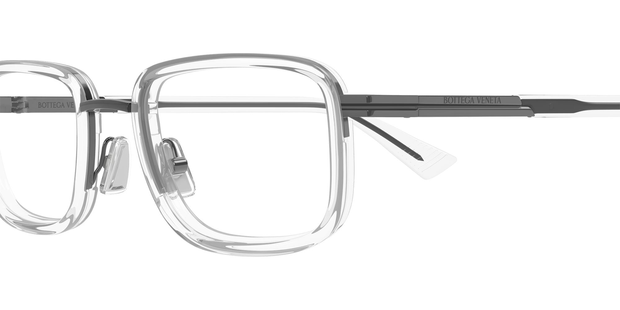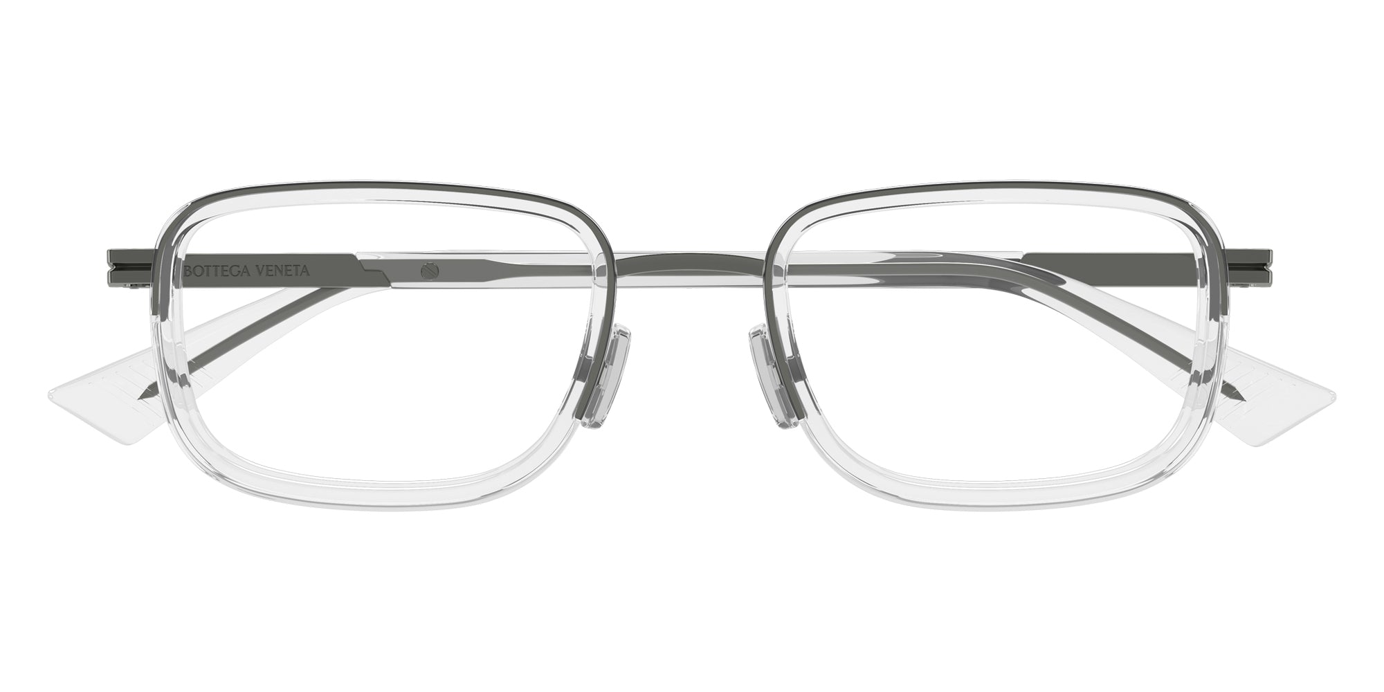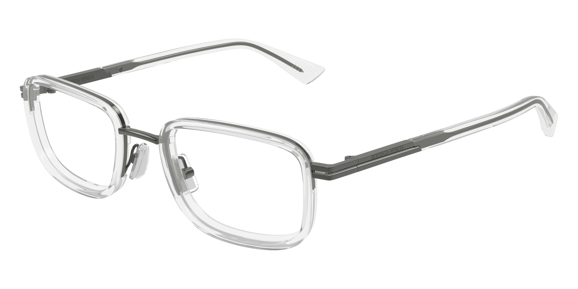 Gunmetal (008) Eyeglasses (BV1464O 008 53) by Bottega Veneta. Size: 53-21-145, Shape: Rectangle, Material: Metal and Recycled Acetate.