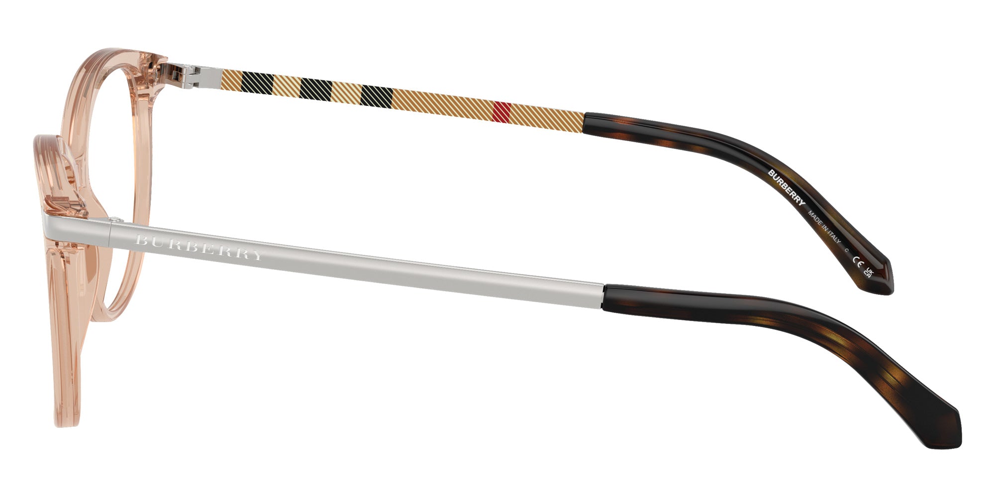 Transparent Peach (3358) Eyeglasses (BE2280 3358 52) by Burberry. Size: 52-16-140, Shape: Square, Material: Acetate and Metal.