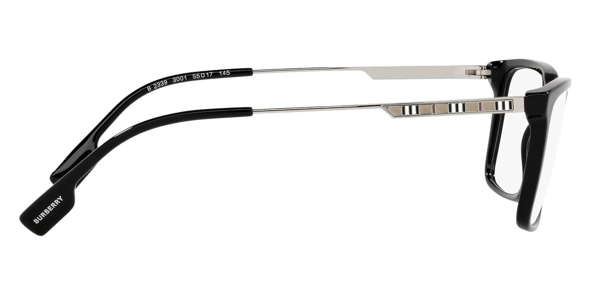 Black (3001) Eyeglasses (BE2339 3001 57) by BURBERRY™. Size: 57-17-145, Shape: Rectangle, Material: Plastic and Metal.