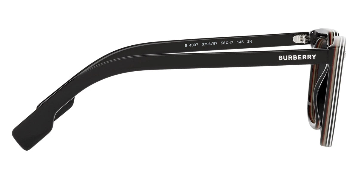 Black (379887) Sunglasses with Dark Gray lenses (BE4337 379887 56) by BURBERRY™. Size: 56-17-145, Shape: Square, Material: Plastic.