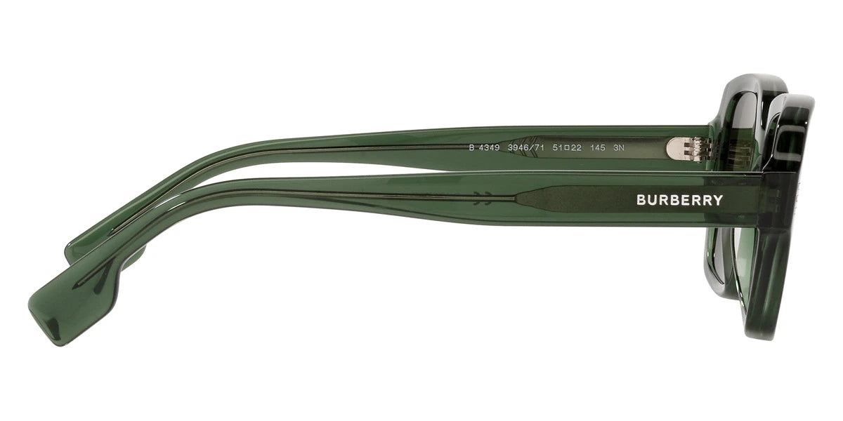 Green (394671) Sunglasses with Dark Green lenses (BE4349 394671 51) by BURBERRY™. Size: 51-22-145, Shape: Rectangle, Material: Plastic.