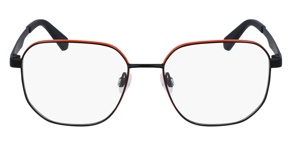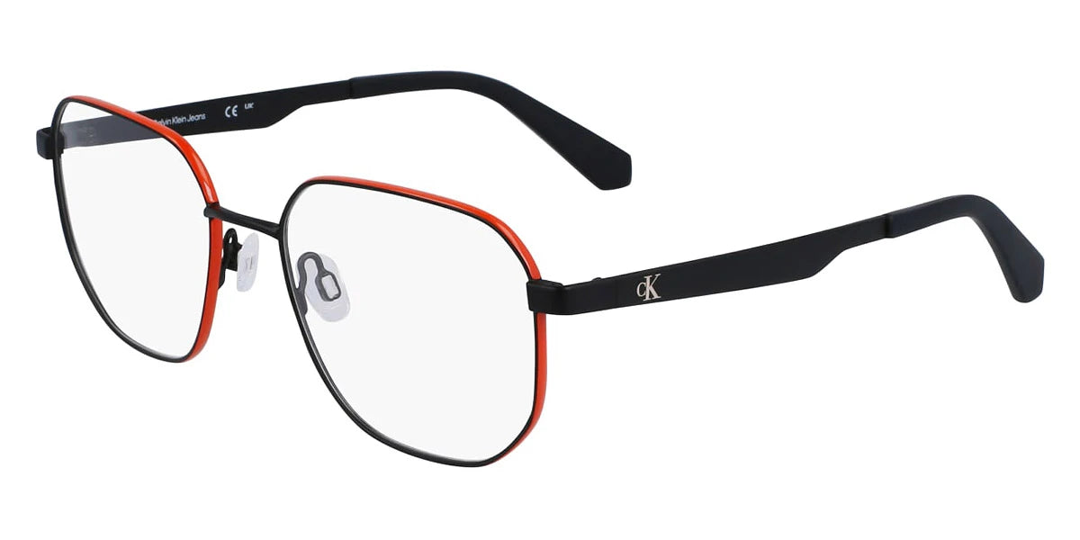 Matte Black/Orange (002) Eyeglasses (CKJ23222 002 53) by Calvin Klein™. Size: 53-18-140, Shape: Square, Material: Metal.