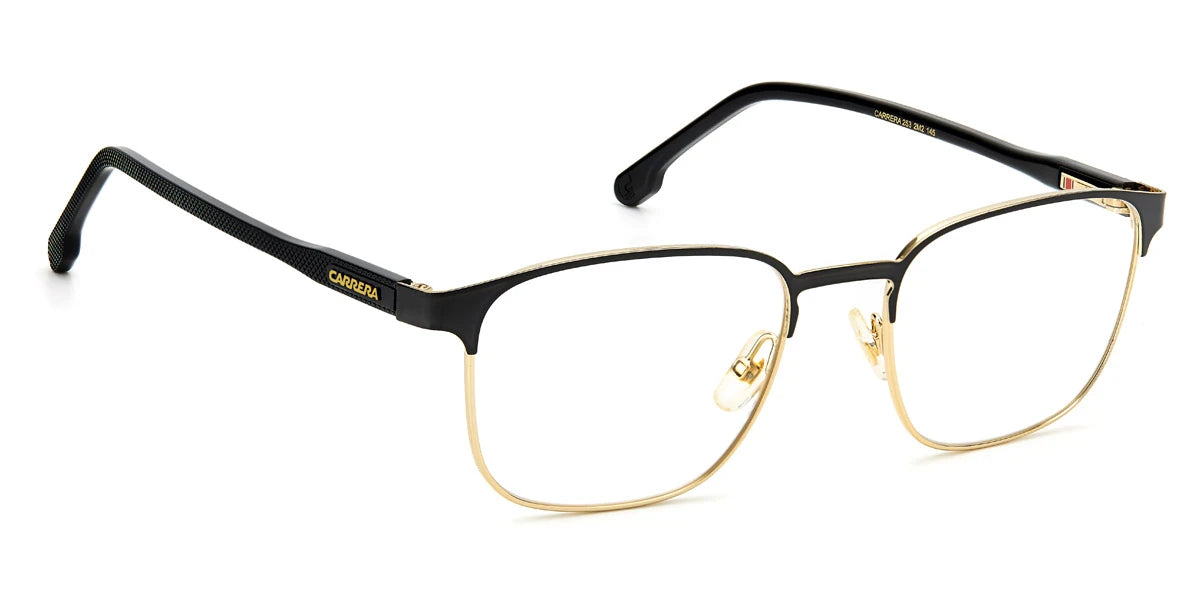 253 Eyeglasses by Carrera™. Shape: Square, Material: Metal, Frame Type: Full Rim. This model is available in three different color combinations and sizes. The Italian brand Carrera is famous all over the world for its quality sun-protection optics, as well as accessories for skiing and racing. Carrera was created in 1956 and at that time the brand was developing sport safety glasses and safety helmets. In the 1980s, the company began producing frames for prescription glasses, which was a huge success as athletes could buy Carrera glasses that they trust in terms of quality, safety and functionality. Today the brand is synonymous with technology, reliability and design.