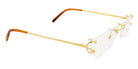 The rectangle shape desing feature a rimless metal recycled acetate frame. This model is available in one different color combinations and sizes. Cartier, a renowned luxury brand with a rich history spanning over a century, is synonymous with elegance, craftsmanship, and timeless style. While Cartier is most celebrated for its exquisite jewelry and watches, the brand's eyewear collection stands as a testament to its commitment to excellence and innovation. Its eyewear captures the essence of Cartier's aesthetic codes, combining traditional craftsmanship with modern designs to create eyewear pieces that are both stylish and functional. Each pair of eyeglasses is meticulously crafted using the finest materials and techniques, resulting in a high-quality product that is built to last. One of the defining features of Cartier eyewear is its iconic and recognizable designs. The brand often incorporates signature elements like the panther motif, the Double C logo, and the Cartier screws, which add a touch of sophistication and luxury to the frames. These distinctive details are a testament to the brand's dedication to creating eyewear that is not only fashionable but also instantly recognizable as a Cartier creation.