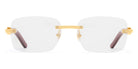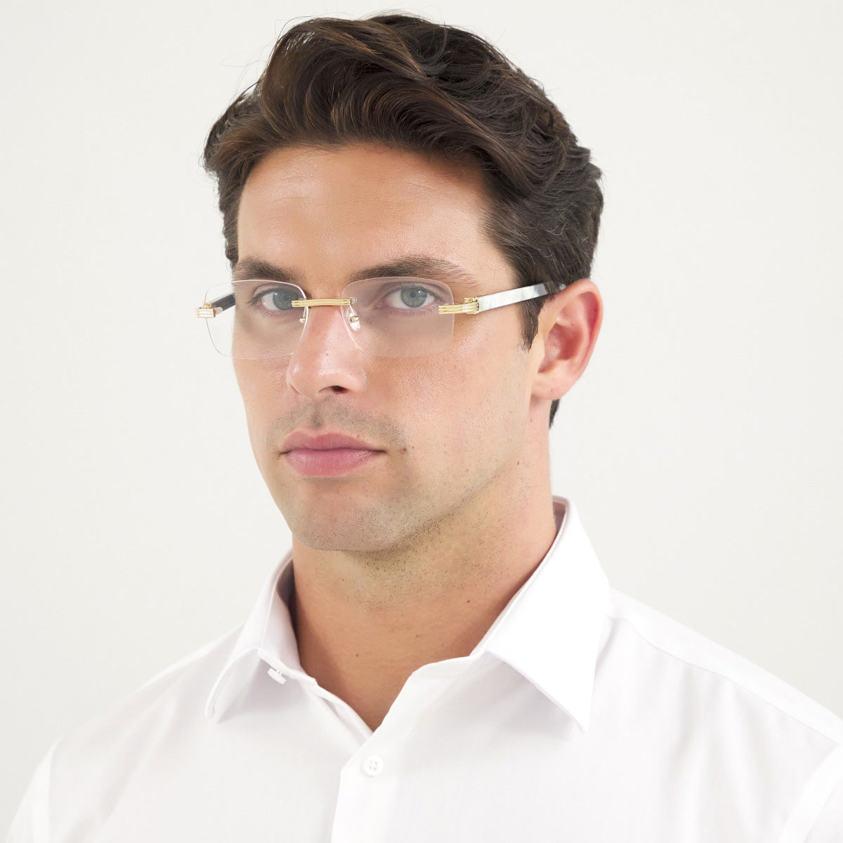 The rectangle shape desing feature a rimless metal horn frame. This model is available in two different color combinations and sizes. Cartier, a renowned luxury brand with a rich history spanning over a century, is synonymous with elegance, craftsmanship, and timeless style. While Cartier is most celebrated for its exquisite jewelry and watches, the brand's eyewear collection stands as a testament to its commitment to excellence and innovation. Its eyewear captures the essence of Cartier's aesthetic codes, combining traditional craftsmanship with modern designs to create eyewear pieces that are both stylish and functional. Each pair of eyeglasses is meticulously crafted using the finest materials and techniques, resulting in a high-quality product that is built to last. One of the defining features of Cartier eyewear is its iconic and recognizable designs. The brand often incorporates signature elements like the panther motif, the Double C logo, and the Cartier screws, which add a touch of sophistication and luxury to the frames. These distinctive details are a testament to the brand's dedication to creating eyewear that is not only fashionable but also instantly recognizable as a Cartier creation.