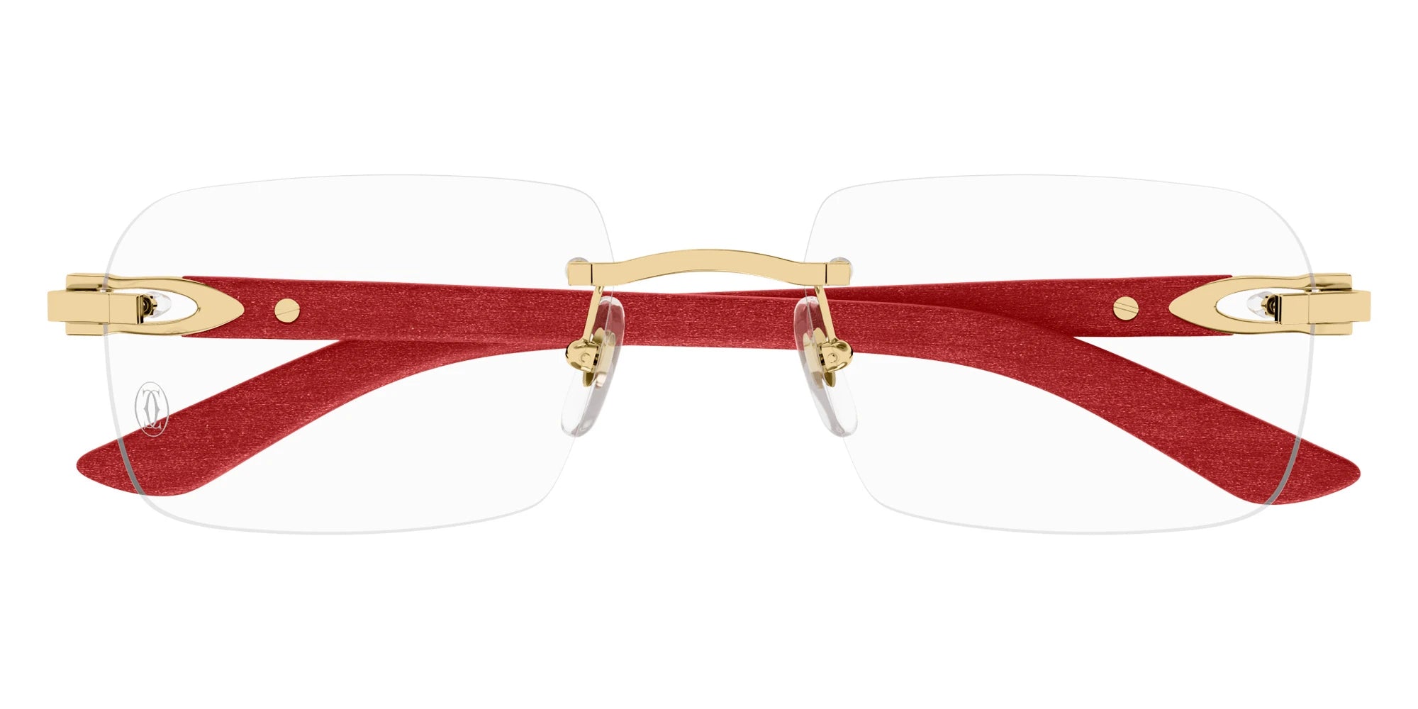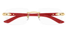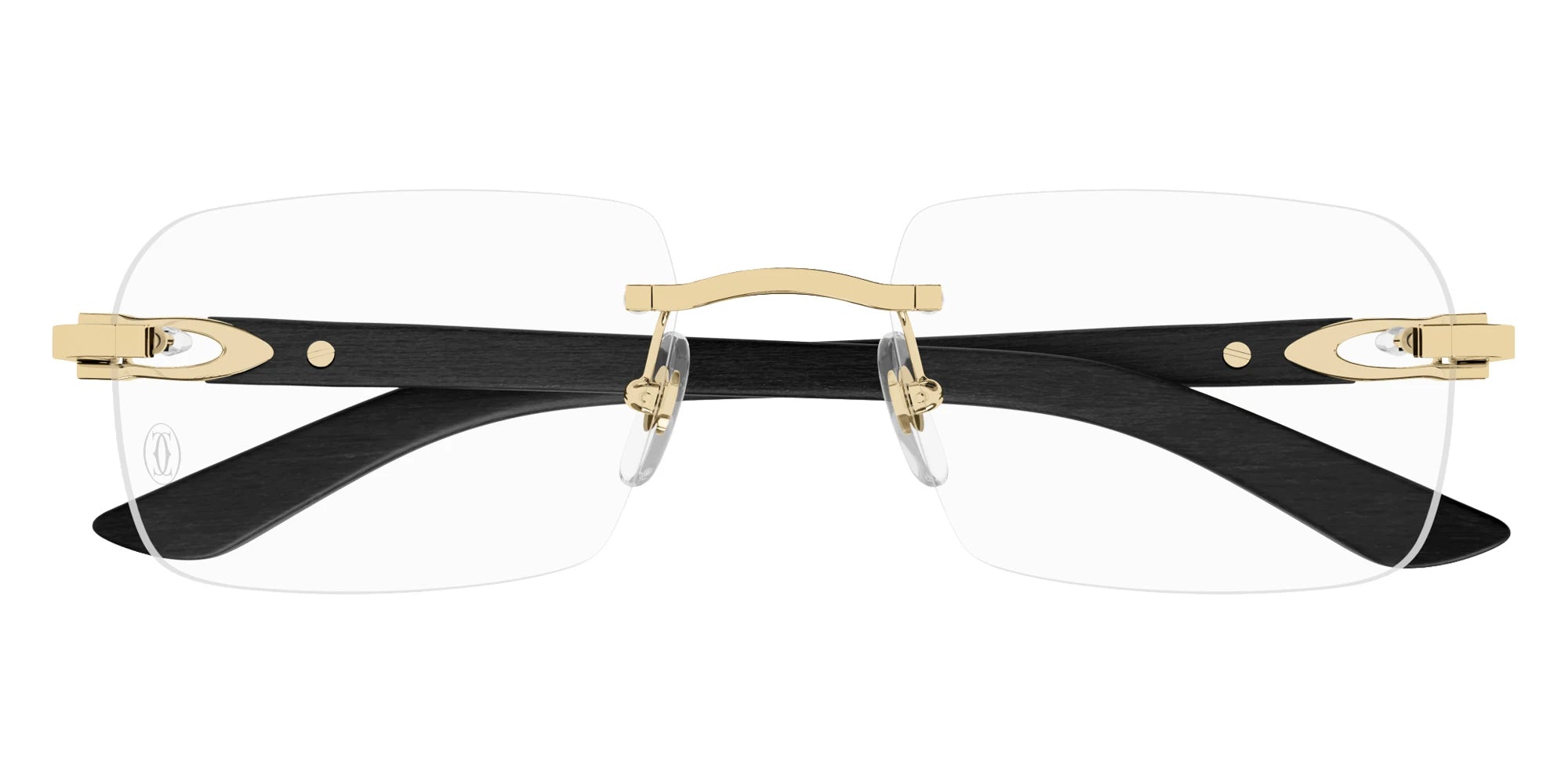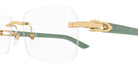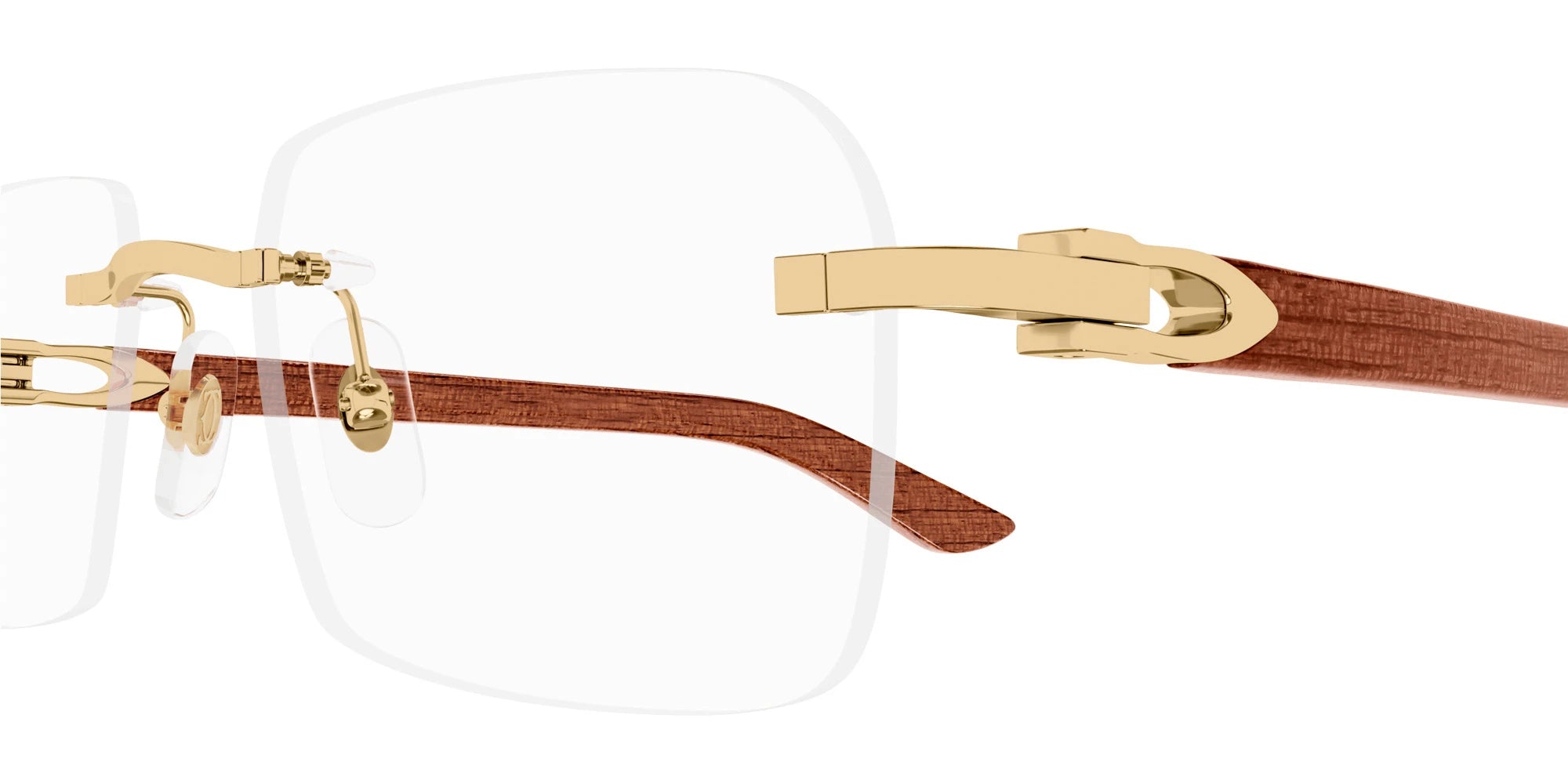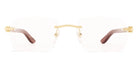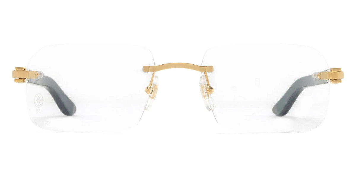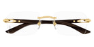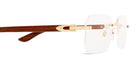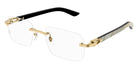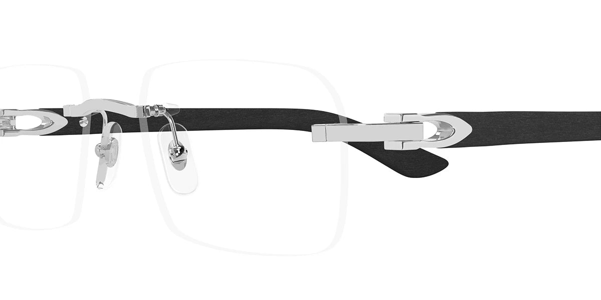 CT0453O Eyeglasses by Cartier™. The rectangle shape design feature a rimless metal and wood frame. This model is available in six different color combinations and sizes. Cartier, a renowned luxury brand with a rich history spanning over a century, is synonymous with elegance, craftsmanship, and timeless style. While Cartier is most celebrated for its exquisite jewelry and watches, the brand's eyewear collection stands as a testament to its commitment to excellence and innovation. Its eyewear captures the essence of Cartier's aesthetic codes, combining traditional craftsmanship with modern designs to create eyewear pieces that are both stylish and functional. Each pair of eyeglasses is meticulously crafted using the finest materials and techniques, resulting in a high-quality product that is built to last. One of the defining features of Cartier eyewear is its iconic and recognizable designs. The brand often incorporates signature elements like the panther motif, the Double C logo, and the Cartier screws, which add a touch of sophistication and luxury to the frames. These distinctive details are a testament to the brand's dedication to creating eyewear that is not only fashionable but also instantly recognizable as a Cartier creation.