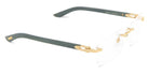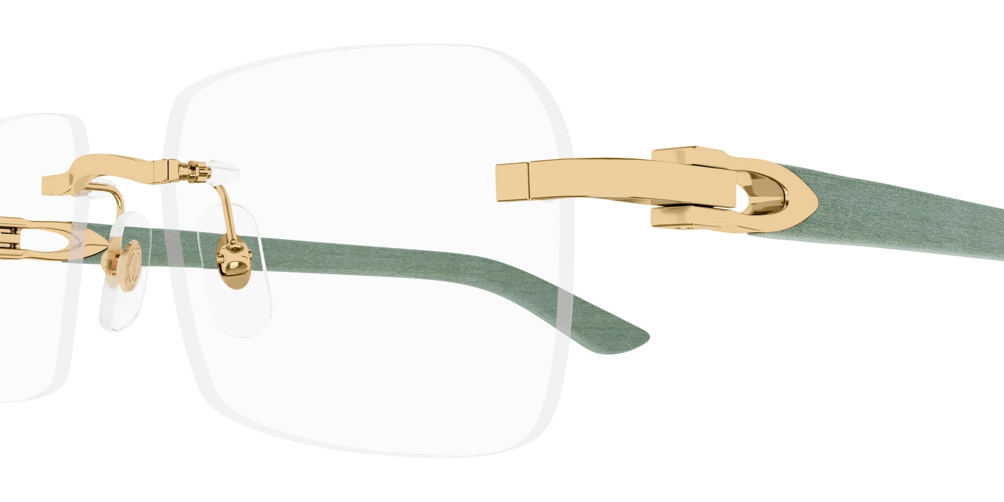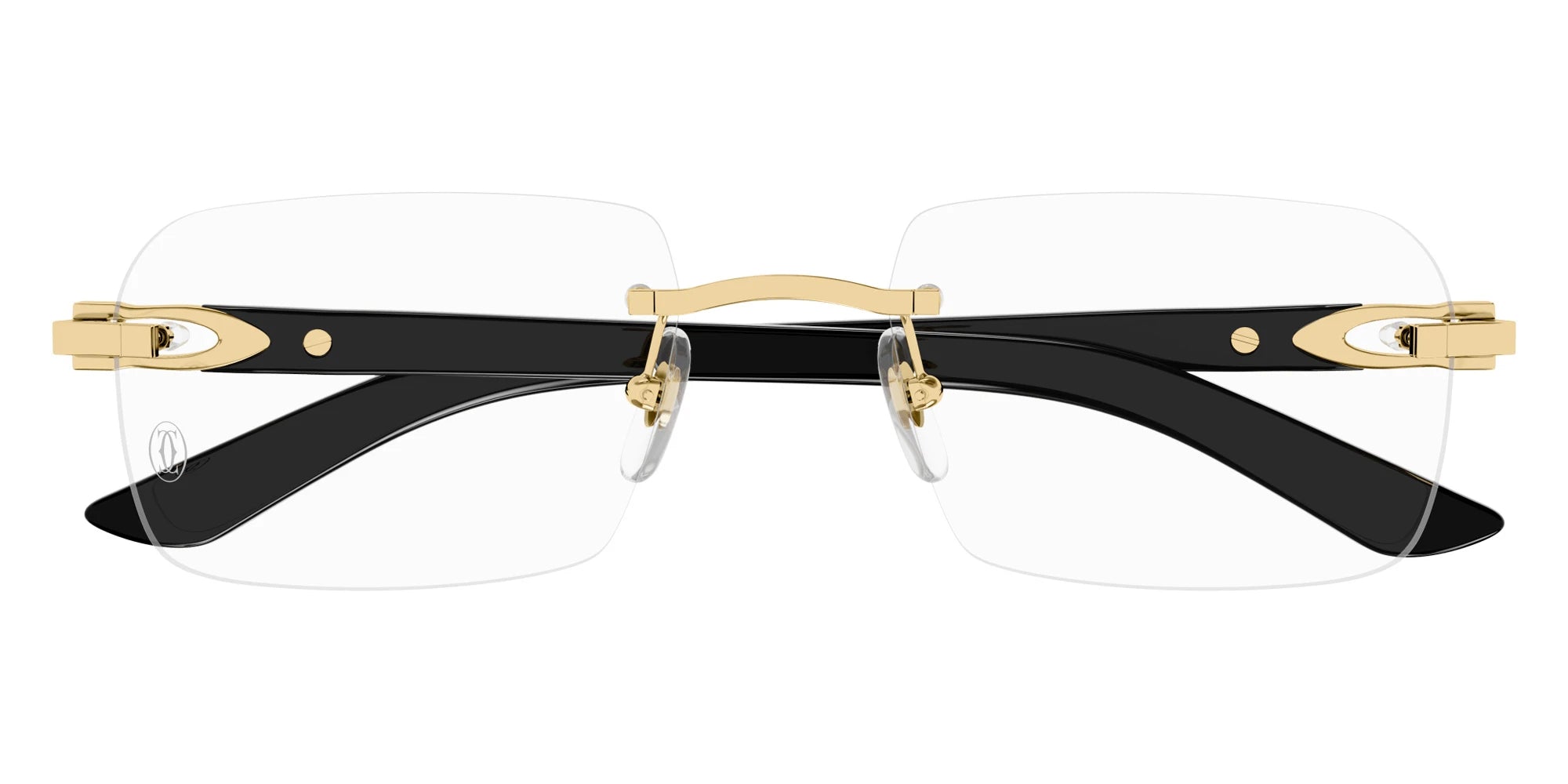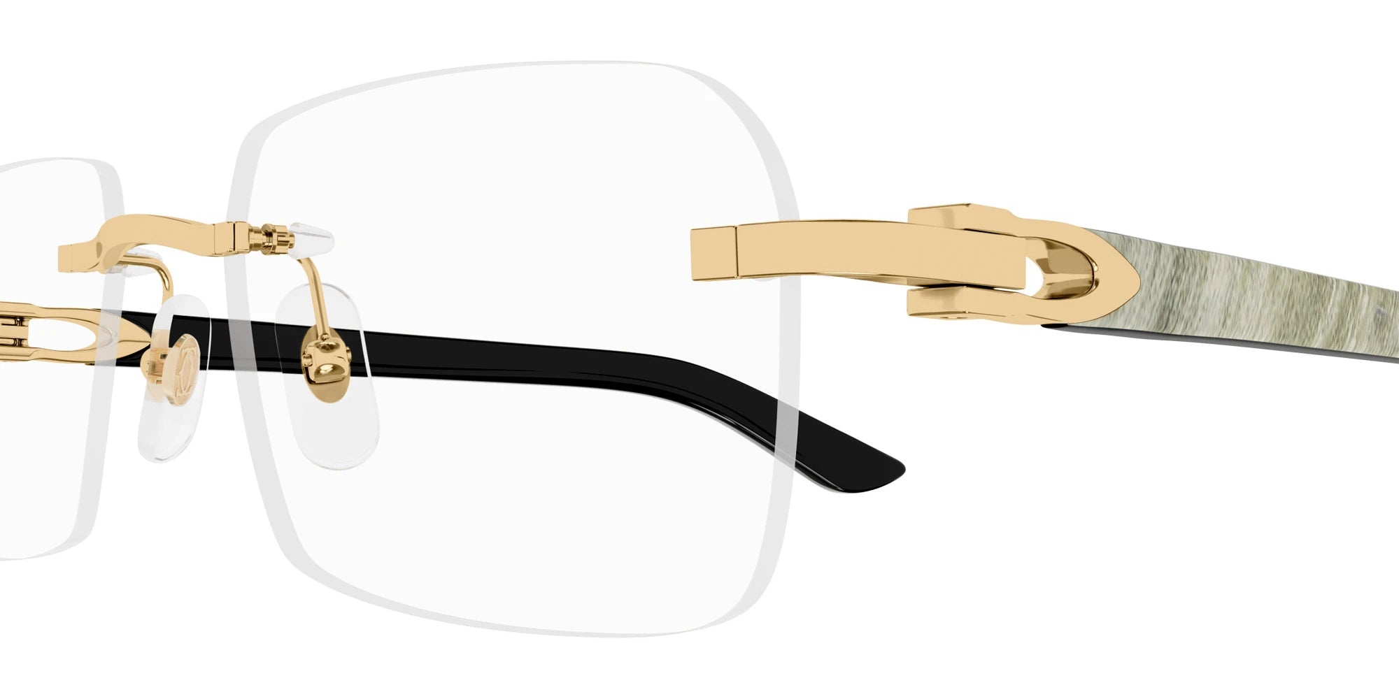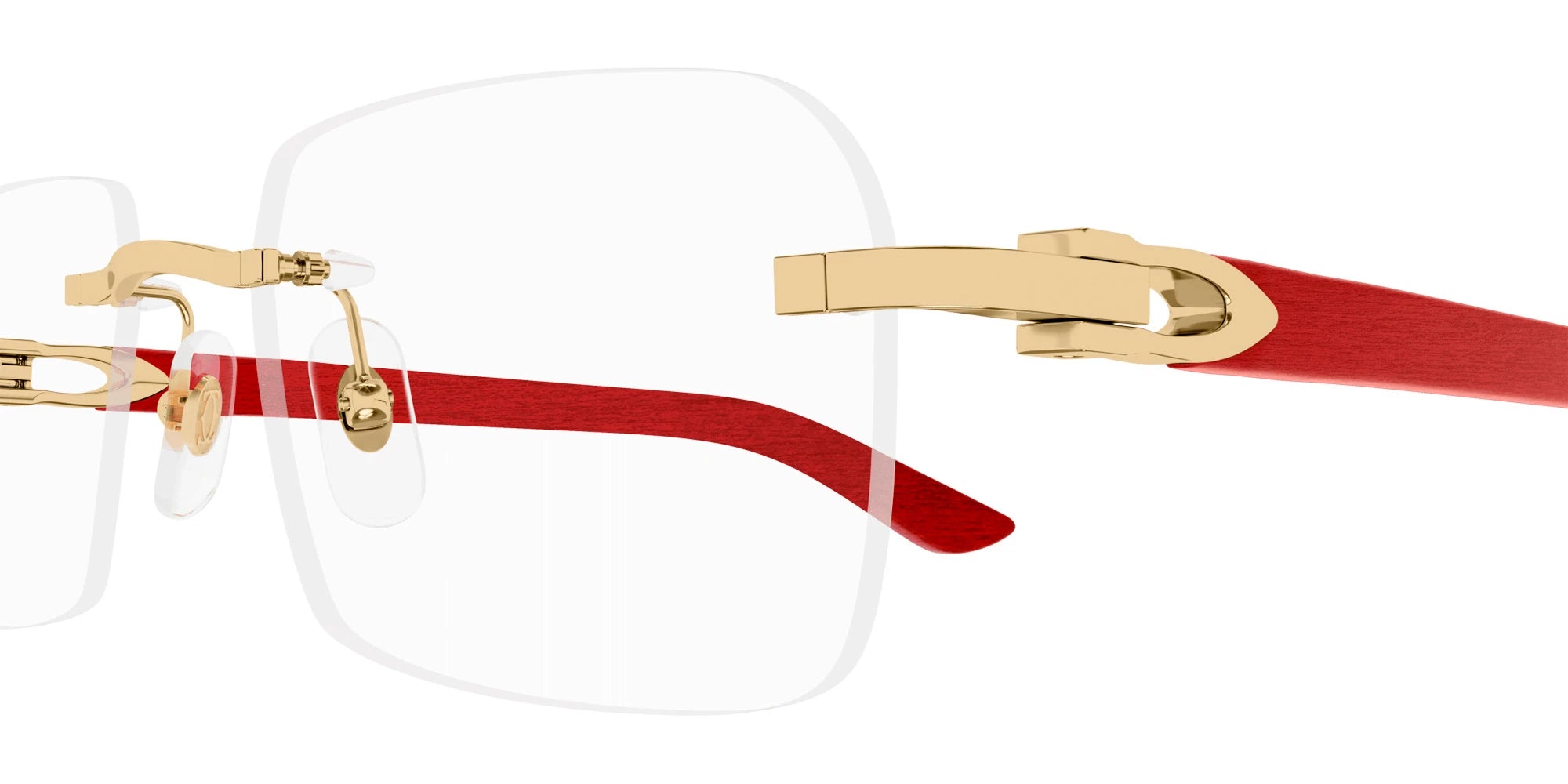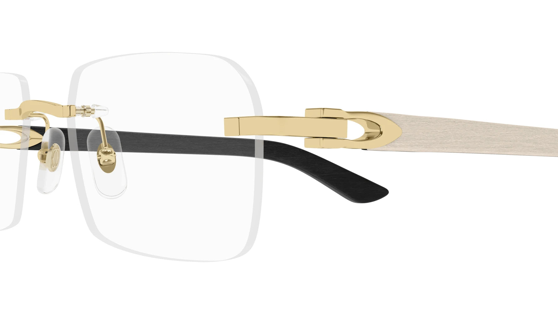 CT0453O Eyeglasses by Cartier™. The rectangle shape design feature a rimless metal and wood frame. This model is available in six different color combinations and sizes. Cartier, a renowned luxury brand with a rich history spanning over a century, is synonymous with elegance, craftsmanship, and timeless style. While Cartier is most celebrated for its exquisite jewelry and watches, the brand's eyewear collection stands as a testament to its commitment to excellence and innovation. Its eyewear captures the essence of Cartier's aesthetic codes, combining traditional craftsmanship with modern designs to create eyewear pieces that are both stylish and functional. Each pair of eyeglasses is meticulously crafted using the finest materials and techniques, resulting in a high-quality product that is built to last. One of the defining features of Cartier eyewear is its iconic and recognizable designs. The brand often incorporates signature elements like the panther motif, the Double C logo, and the Cartier screws, which add a touch of sophistication and luxury to the frames. These distinctive details are a testament to the brand's dedication to creating eyewear that is not only fashionable but also instantly recognizable as a Cartier creation.