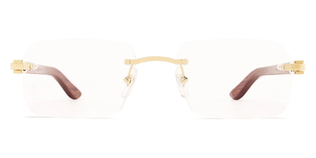 Gold/Brown (004) Eyeglasses (CT0453O 004 56) by Cartier™. Size: 56-19-145, Shape: Rectangle, Material: Metal and Wood.
