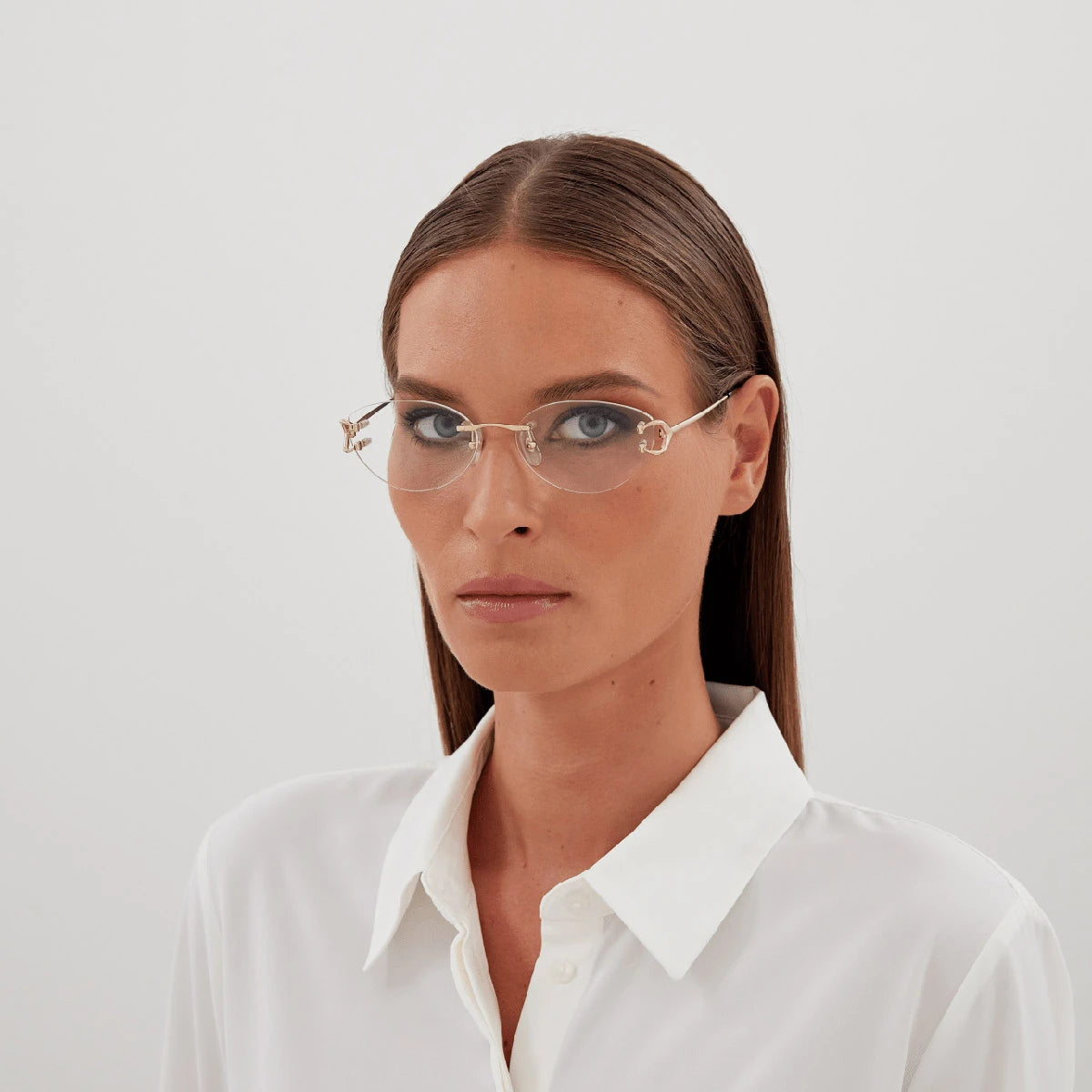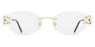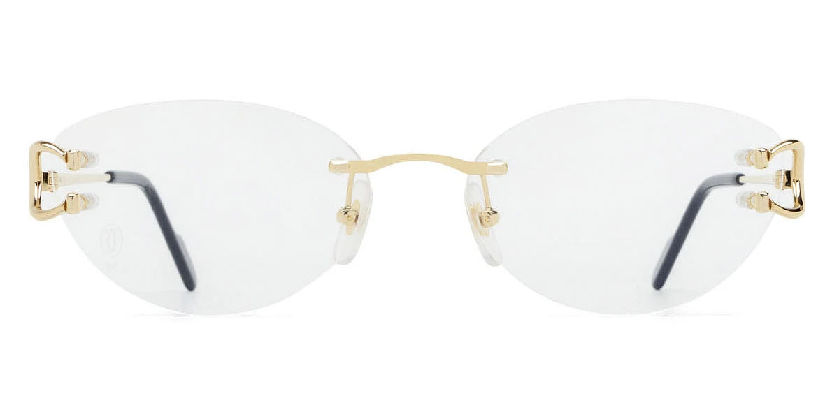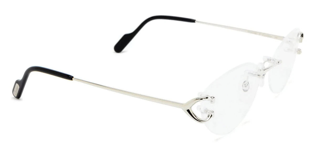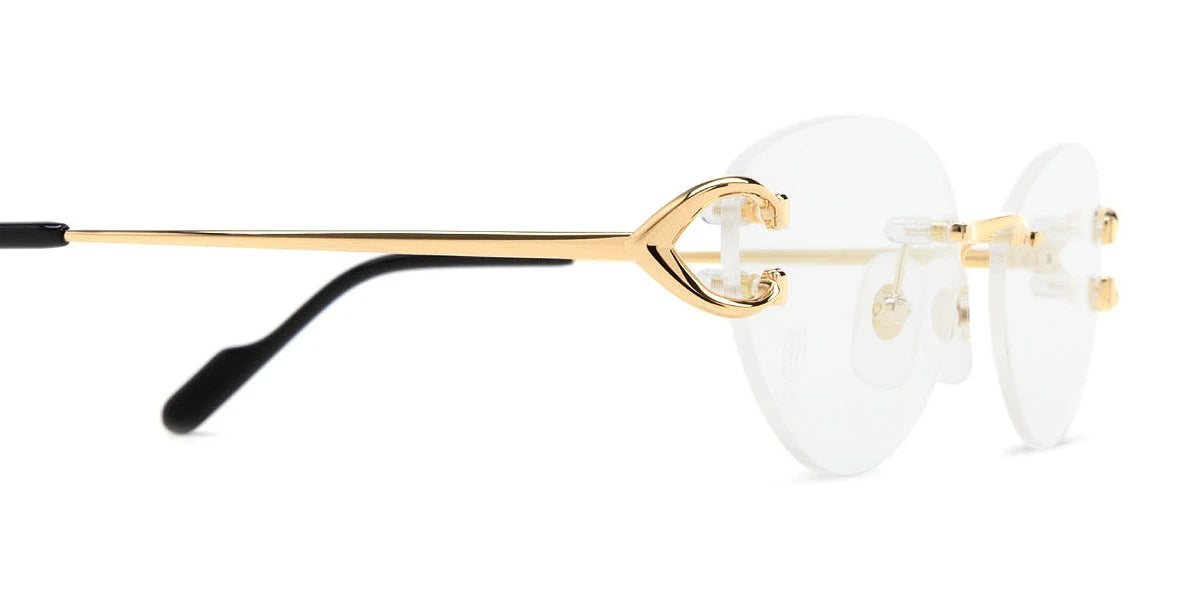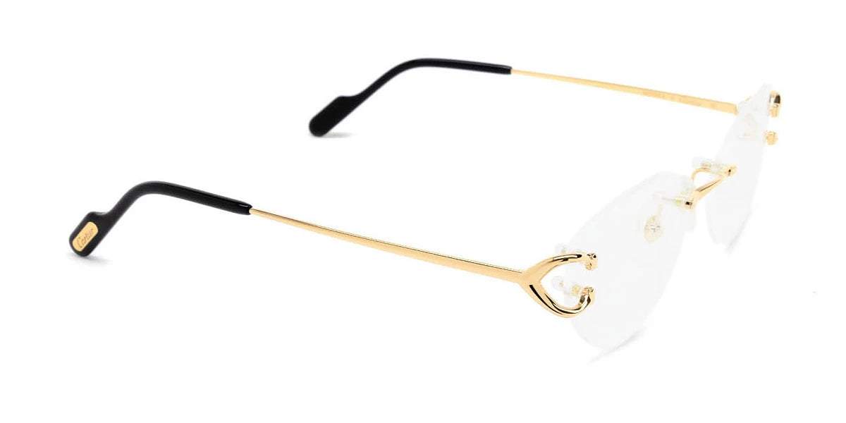 CT0487O Eyeglasses by Cartier™. The cat-eye shape design feature a rimless metal frame. This model is available in two different color combinations and sizes. Cartier, a renowned luxury brand with a rich history spanning over a century, is synonymous with elegance, craftsmanship, and timeless style. While Cartier is most celebrated for its exquisite jewelry and watches, the brand's eyewear collection stands as a testament to its commitment to excellence and innovation. Its eyewear captures the essence of Cartier's aesthetic codes, combining traditional craftsmanship with modern designs to create eyewear pieces that are both stylish and functional. Each pair of eyeglasses is meticulously crafted using the finest materials and techniques, resulting in a high-quality product that is built to last. One of the defining features of Cartier eyewear is its iconic and recognizable designs. The brand often incorporates signature elements like the panther motif, the Double C logo, and the Cartier screws, which add a touch of sophistication and luxury to the frames. These distinctive details are a testament to the brand's dedication to creating eyewear that is not only fashionable but also instantly recognizable as a Cartier creation.