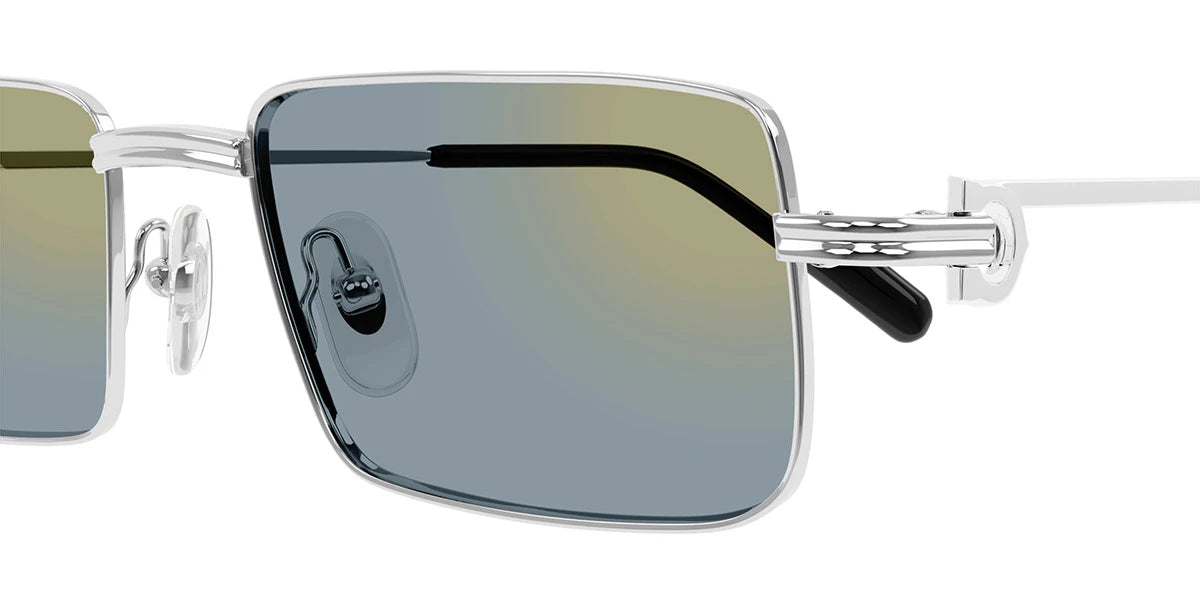 CT0501S Sunglasses by Cartier™. The rectangle shape design feature a full rim metal and recycled acetate frame. This model is available in one color combination. Cartier, a renowned luxury brand with a rich history spanning over a century, is synonymous with elegance, craftsmanship, and timeless style. While Cartier is most celebrated for its exquisite jewelry and watches, the brand's eyewear collection stands as a testament to its commitment to excellence and innovation. Its eyewear captures the essence of Cartier's aesthetic codes, combining traditional craftsmanship with modern designs to create eyewear pieces that are both stylish and functional. Each pair of sunglasses is meticulously crafted using the finest materials and techniques, resulting in a high-quality product that is built to last. One of the defining features of Cartier eyewear is its iconic and recognizable designs. The brand often incorporates signature elements like the panther motif, the Double C logo, and the Cartier screws, which add a touch of sophistication and luxury to the frames. These distinctive details are a testament to the brand's dedication to creating eyewear that is not only fashionable but also instantly recognizable as a Cartier creation.