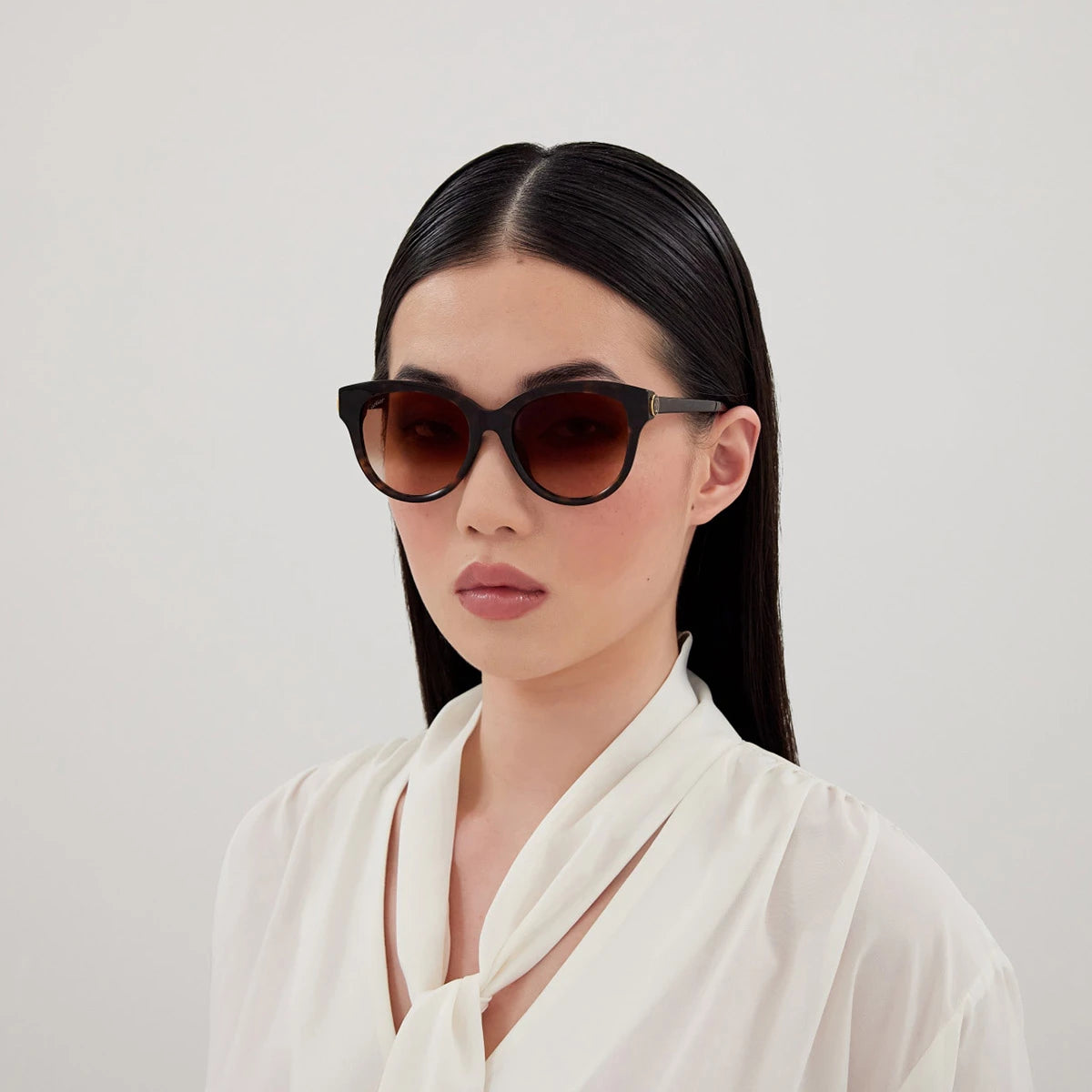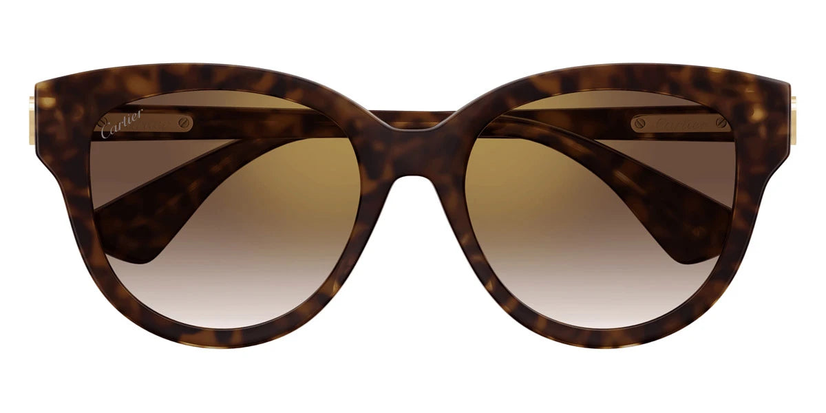 CT0506SA Sunglasses by Cartier™. The cat-eye shape design feature a full rim metal and recycled acetate frame. This model is available in one color combination. Cartier, a renowned luxury brand with a rich history spanning over a century, is synonymous with elegance, craftsmanship, and timeless style. While Cartier is most celebrated for its exquisite jewelry and watches, the brand's eyewear collection stands as a testament to its commitment to excellence and innovation. Its eyewear captures the essence of Cartier's aesthetic codes, combining traditional craftsmanship with modern designs to create eyewear pieces that are both stylish and functional. Each pair of sunglasses is meticulously crafted using the finest materials and techniques, resulting in a high-quality product that is built to last. One of the defining features of Cartier eyewear is its iconic and recognizable designs. The brand often incorporates signature elements like the panther motif, the Double C logo, and the Cartier screws, which add a touch of sophistication and luxury to the frames. These distinctive details are a testament to the brand's dedication to creating eyewear that is not only fashionable but also instantly recognizable as a Cartier creation.