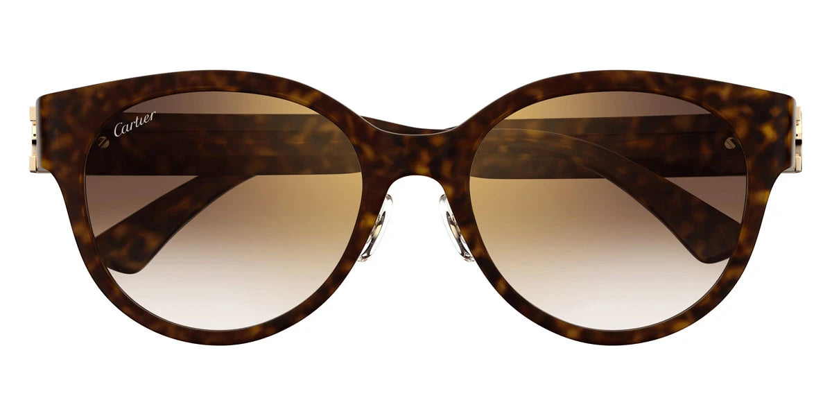 CT0510SJ Sunglasses by Cartier™. The cat-eye shape design feature a full rim metal and recycled acetate frame. This model is available in one color combination. Cartier, a renowned luxury brand with a rich history spanning over a century, is synonymous with elegance, craftsmanship, and timeless style. While Cartier is most celebrated for its exquisite jewelry and watches, the brand's eyewear collection stands as a testament to its commitment to excellence and innovation. Its eyewear captures the essence of Cartier's aesthetic codes, combining traditional craftsmanship with modern designs to create eyewear pieces that are both stylish and functional. Each pair of sunglasses is meticulously crafted using the finest materials and techniques, resulting in a high-quality product that is built to last. One of the defining features of Cartier eyewear is its iconic and recognizable designs. The brand often incorporates signature elements like the panther motif, the Double C logo, and the Cartier screws, which add a touch of sophistication and luxury to the frames. These distinctive details are a testament to the brand's dedication to creating eyewear that is not only fashionable but also instantly recognizable as a Cartier creation.