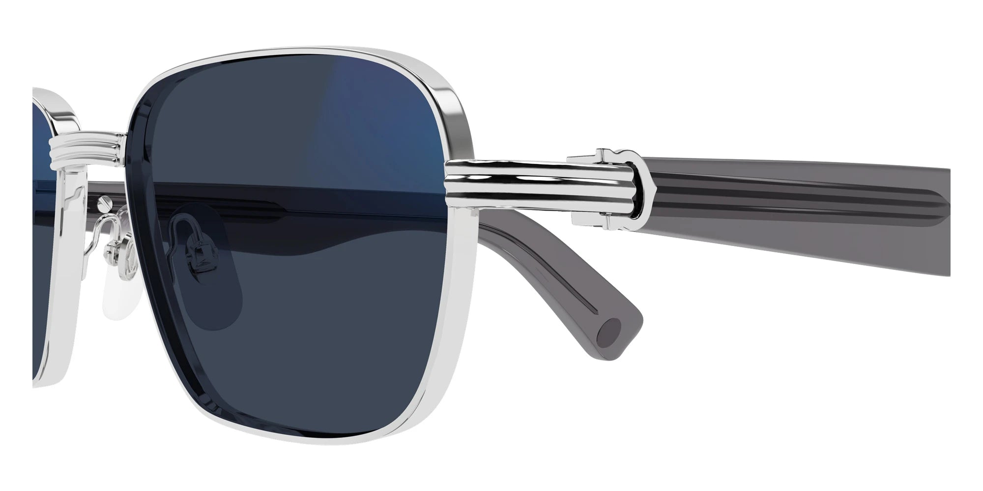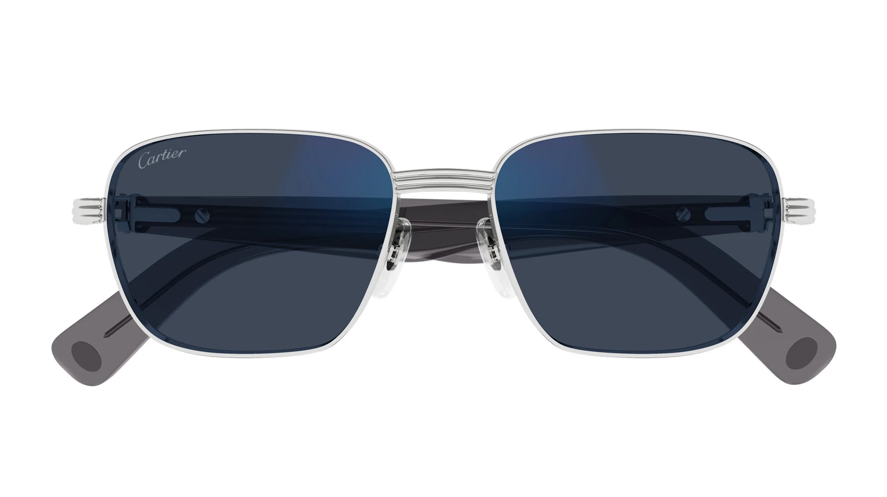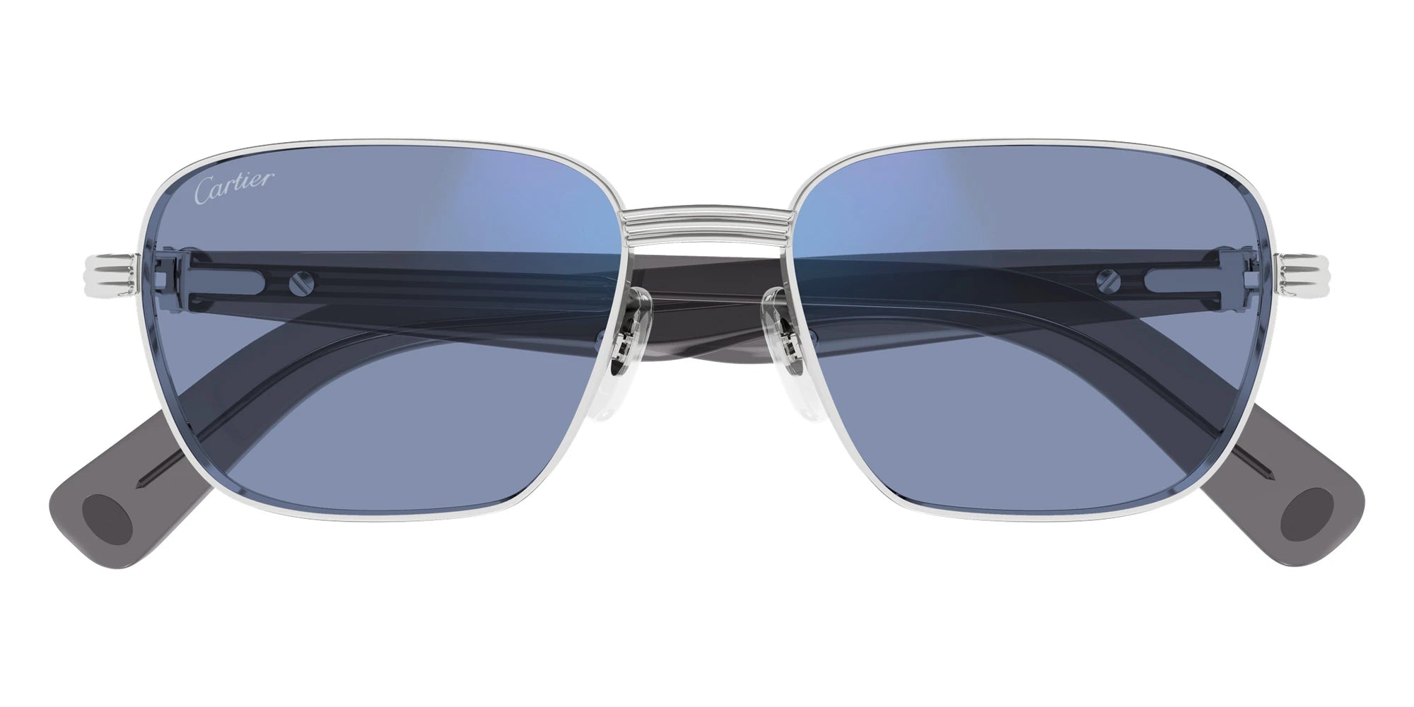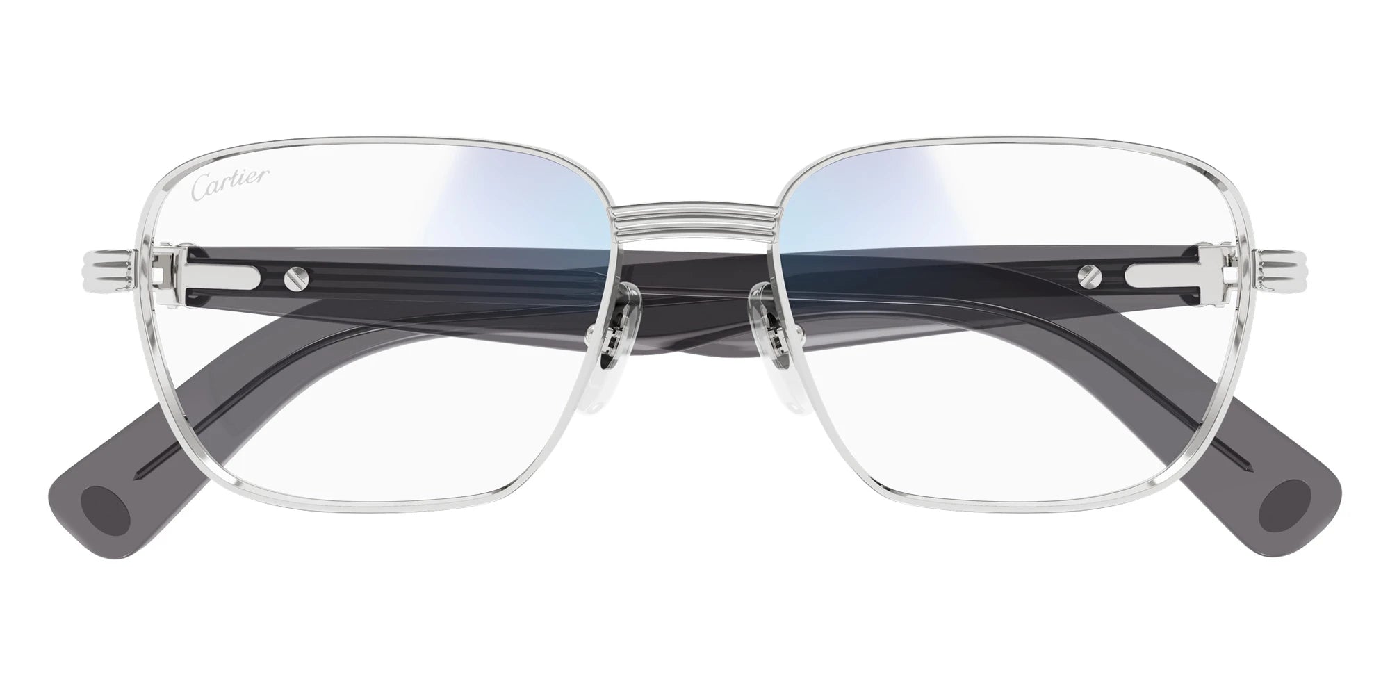 Silver/Gray (010) Sunglasses with Transparent Photochromatic lenses (CT0538S 010 55) by Cartier™. Size: 55-17-145, Shape: Square, Material: Metal and Recycled Acetate.