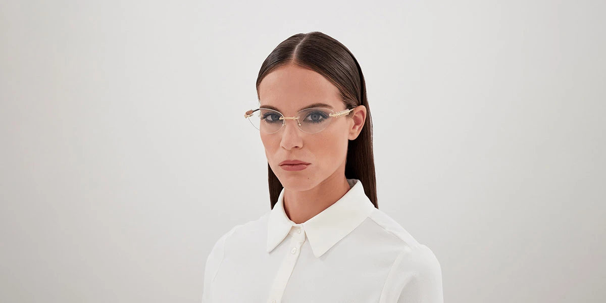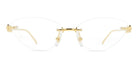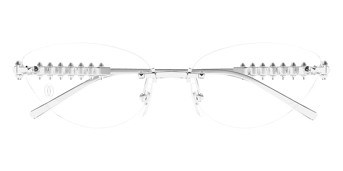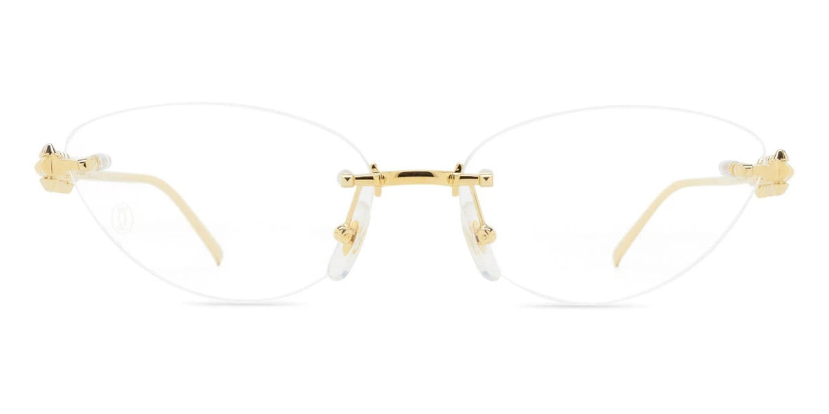 CT0565O Eyeglasses by Cartier™. The cat-eye shape design feature a rimless metal frame. This model is available in two different color combinations and sizes. Cartier, a renowned luxury brand with a rich history spanning over a century, is synonymous with elegance, craftsmanship, and timeless style. While Cartier is most celebrated for its exquisite jewelry and watches, the brand's eyewear collection stands as a testament to its commitment to excellence and innovation. Its eyewear captures the essence of Cartier's aesthetic codes, combining traditional craftsmanship with modern designs to create eyewear pieces that are both stylish and functional. Each pair of eyeglasses is meticulously crafted using the finest materials and techniques, resulting in a high-quality product that is built to last. One of the defining features of Cartier eyewear is its iconic and recognizable designs. The brand often incorporates signature elements like the panther motif, the Double C logo, and the Cartier screws, which add a touch of sophistication and luxury to the frames. These distinctive details are a testament to the brand's dedication to creating eyewear that is not only fashionable but also instantly recognizable as a Cartier creation.