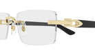 CT0581O Eyeglasses by Cartier™. The rectangle shape design feature a rimless metal and recycled acetate frame. This model is available in three different color combinations and sizes. Cartier, a renowned luxury brand with a rich history spanning over a century, is synonymous with elegance, craftsmanship, and timeless style. While Cartier is most celebrated for its exquisite jewelry and watches, the brand's eyewear collection stands as a testament to its commitment to excellence and innovation. Its eyewear captures the essence of Cartier's aesthetic codes, combining traditional craftsmanship with modern designs to create eyewear pieces that are both stylish and functional. Each pair of eyeglasses is meticulously crafted using the finest materials and techniques, resulting in a high-quality product that is built to last. One of the defining features of Cartier eyewear is its iconic and recognizable designs. The brand often incorporates signature elements like the panther motif, the Double C logo, and the Cartier screws, which add a touch of sophistication and luxury to the frames. These distinctive details are a testament to the brand's dedication to creating eyewear that is not only fashionable but also instantly recognizable as a Cartier creation.