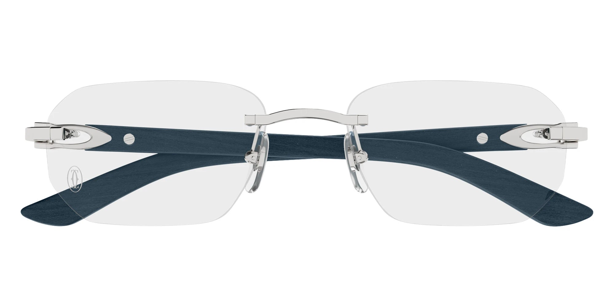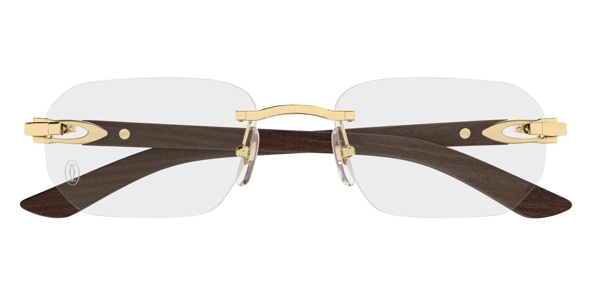 CT0583O Eyeglasses by Cartier™. The rectangle shape design feature a rimless metal and wood frame. This model is available in three different color combinations and sizes. Cartier, a renowned luxury brand with a rich history spanning over a century, is synonymous with elegance, craftsmanship, and timeless style. While Cartier is most celebrated for its exquisite jewelry and watches, the brand's eyewear collection stands as a testament to its commitment to excellence and innovation. Its eyewear captures the essence of Cartier's aesthetic codes, combining traditional craftsmanship with modern designs to create eyewear pieces that are both stylish and functional. Each pair of eyeglasses is meticulously crafted using the finest materials and techniques, resulting in a high-quality product that is built to last. One of the defining features of Cartier eyewear is its iconic and recognizable designs. The brand often incorporates signature elements like the panther motif, the Double C logo, and the Cartier screws, which add a touch of sophistication and luxury to the frames. These distinctive details are a testament to the brand's dedication to creating eyewear that is not only fashionable but also instantly recognizable as a Cartier creation.