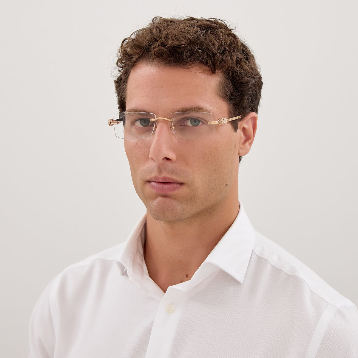 The rectangle shape desing feature a rimless gold stone frame. This model is available in three different color combinations and sizes. Cartier, a renowned luxury brand with a rich history spanning over a century, is synonymous with elegance, craftsmanship, and timeless style. While Cartier is most celebrated for its exquisite jewelry and watches, the brand's eyewear collection stands as a testament to its commitment to excellence and innovation. Its eyewear captures the essence of Cartier's aesthetic codes, combining traditional craftsmanship with modern designs to create eyewear pieces that are both stylish and functional. Each pair of eyeglasses is meticulously crafted using the finest materials and techniques, resulting in a high-quality product that is built to last. One of the defining features of Cartier eyewear is its iconic and recognizable designs. The brand often incorporates signature elements like the panther motif, the Double C logo, and the Cartier screws, which add a touch of sophistication and luxury to the frames. These distinctive details are a testament to the brand's dedication to creating eyewear that is not only fashionable but also instantly recognizable as a Cartier creation.