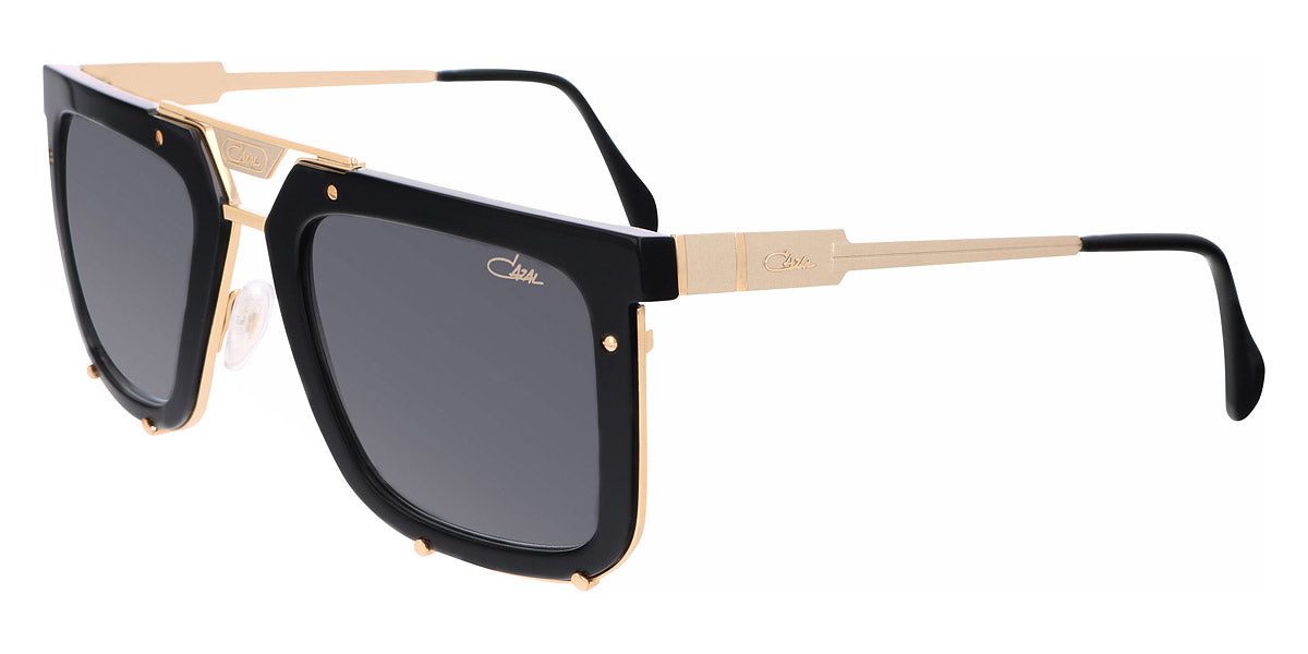 Black-Gold (001) Sunglasses with Gray Gradient lenses (648 001 56) by Cazal™. Size: 56-25-147, Shape: Square, Material: Acetate and Metal.