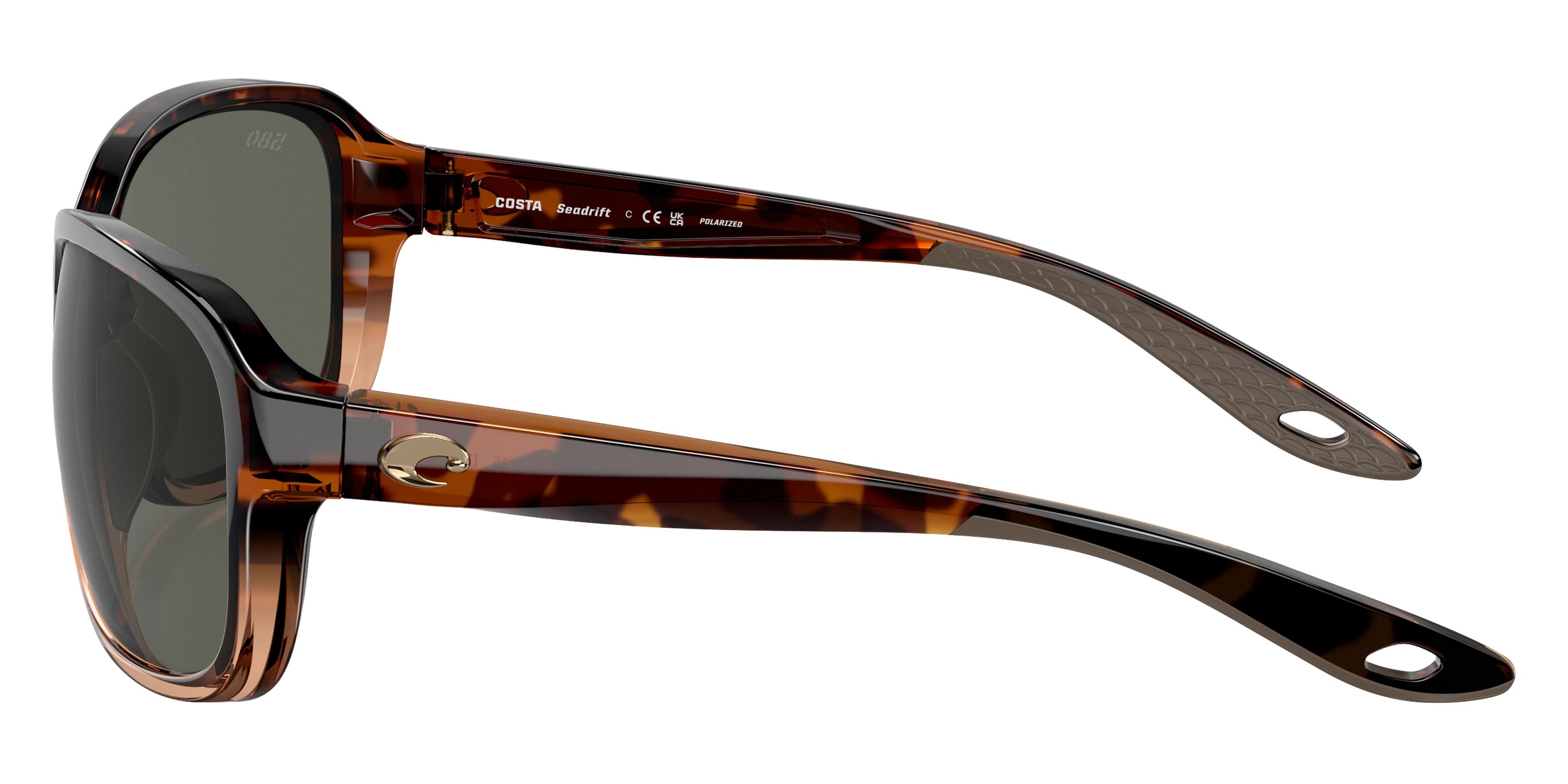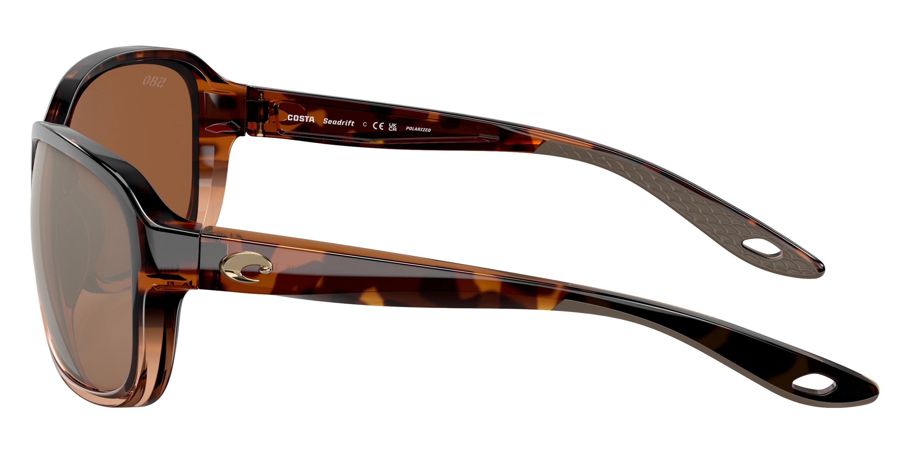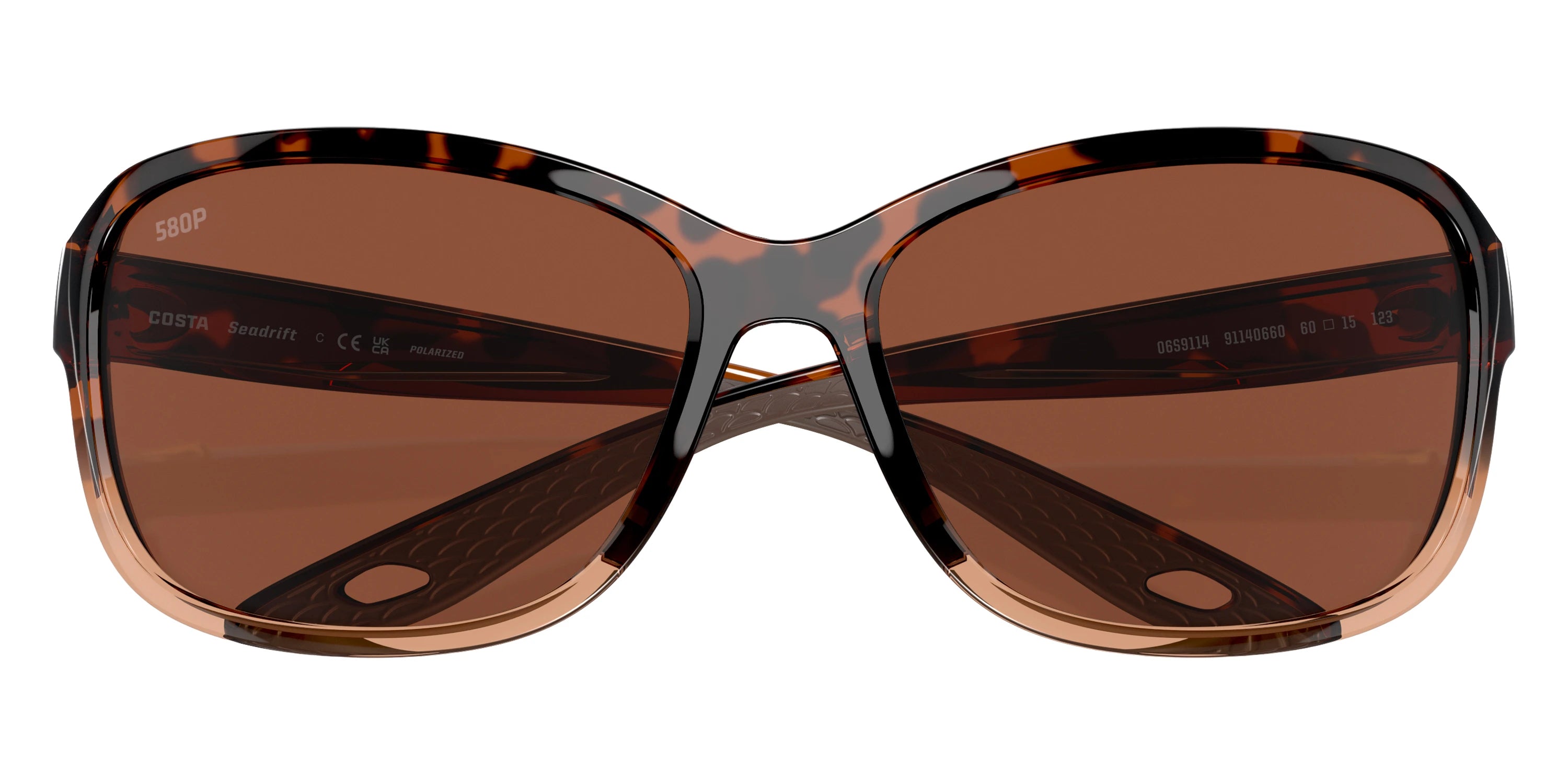 Shiny Tortoise Fade frame with Copper Polarized lenses, COSTA part 6S9114 Seadrift 911406 58, has a Square Shape made out of Injected in size: 58-15-123. This model comes in Shiny Tortoise Fade frame. Color Code: 911406 Shiny Tortoise Fade